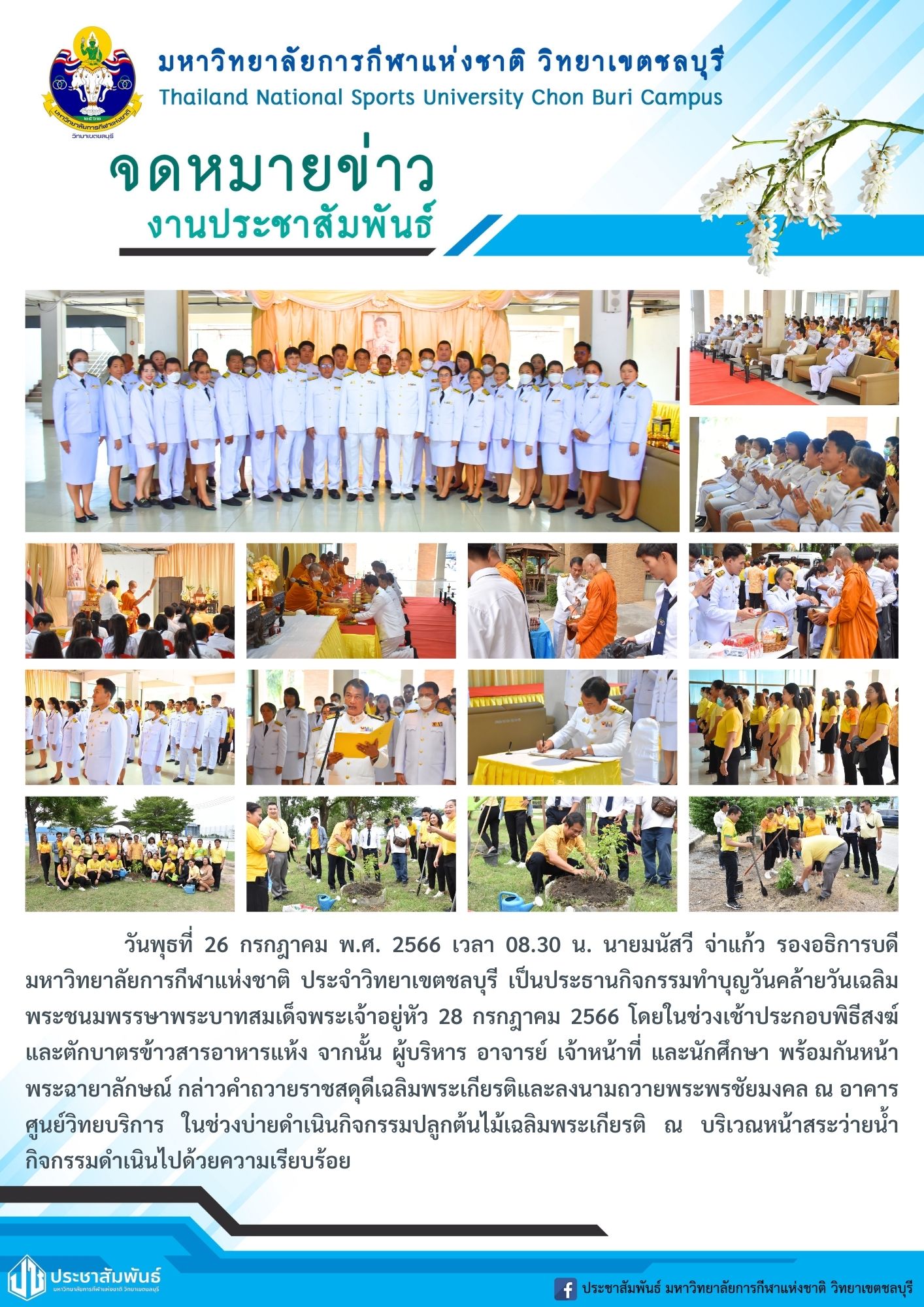นายมนัสวี จ่าแก้ว รองอธิการบดีมหาวิทยาลัยการกีฬาแห่งชาติ ประจำวิทยาเขตชลบุรี เป็นประธานพิธี กิจกรรมทำบุญวันคล้ายวันเฉลิมพระชนมพรรษาพระบาทสมเด้จพระเจ้าอยู่หัว และกิจกรรมปลูกต้นไม้เฉลิมพระเกียรติ พร้อมกับ ผู้บริหาร คณาจารย์ และนักศึกษา