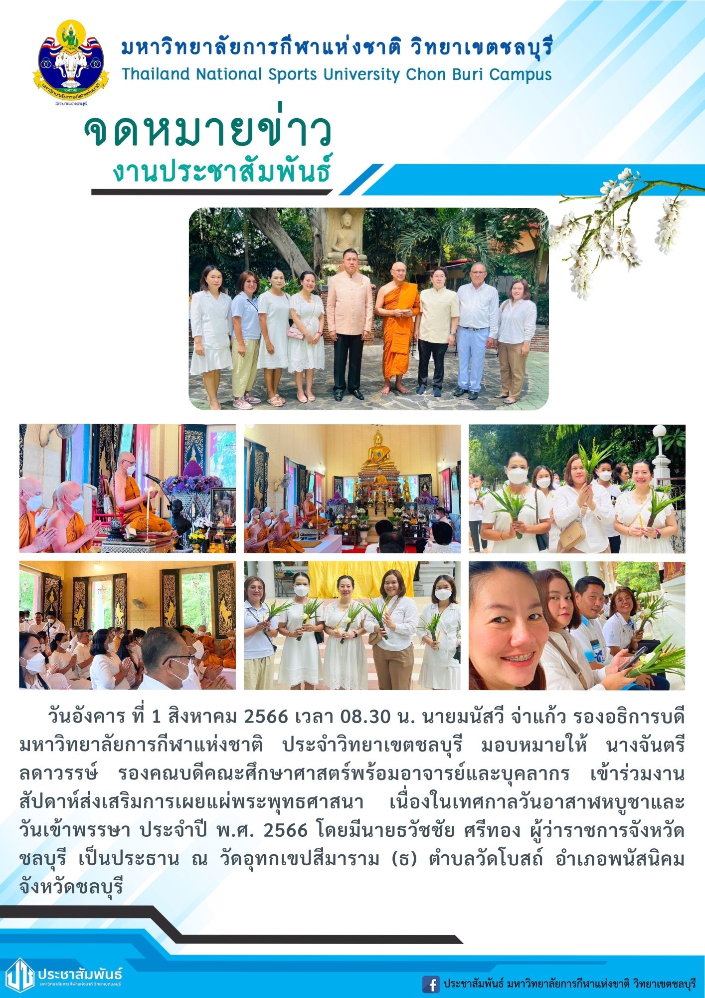 นายมนัสวี จ่าแก้ว รองอธิการบดีมหาวิทยาลัยการกีฬาแห่งชาติ ประจำวิทยาเขตชลบุรี มอบหมายให้ นางจันตรี ลดาวรรษ์ รองคณะบดีคณะศึกษาศาสตร์พร้อมคณาจารย์และบุคลากร เข้าร่วมงานสัปดาห์ส่งเสริมการเผยแพร่พระพุทธศาสนา เนื่องในเทศกาลวันอาสาฬหบูชาและวันเข้าพรรษา
