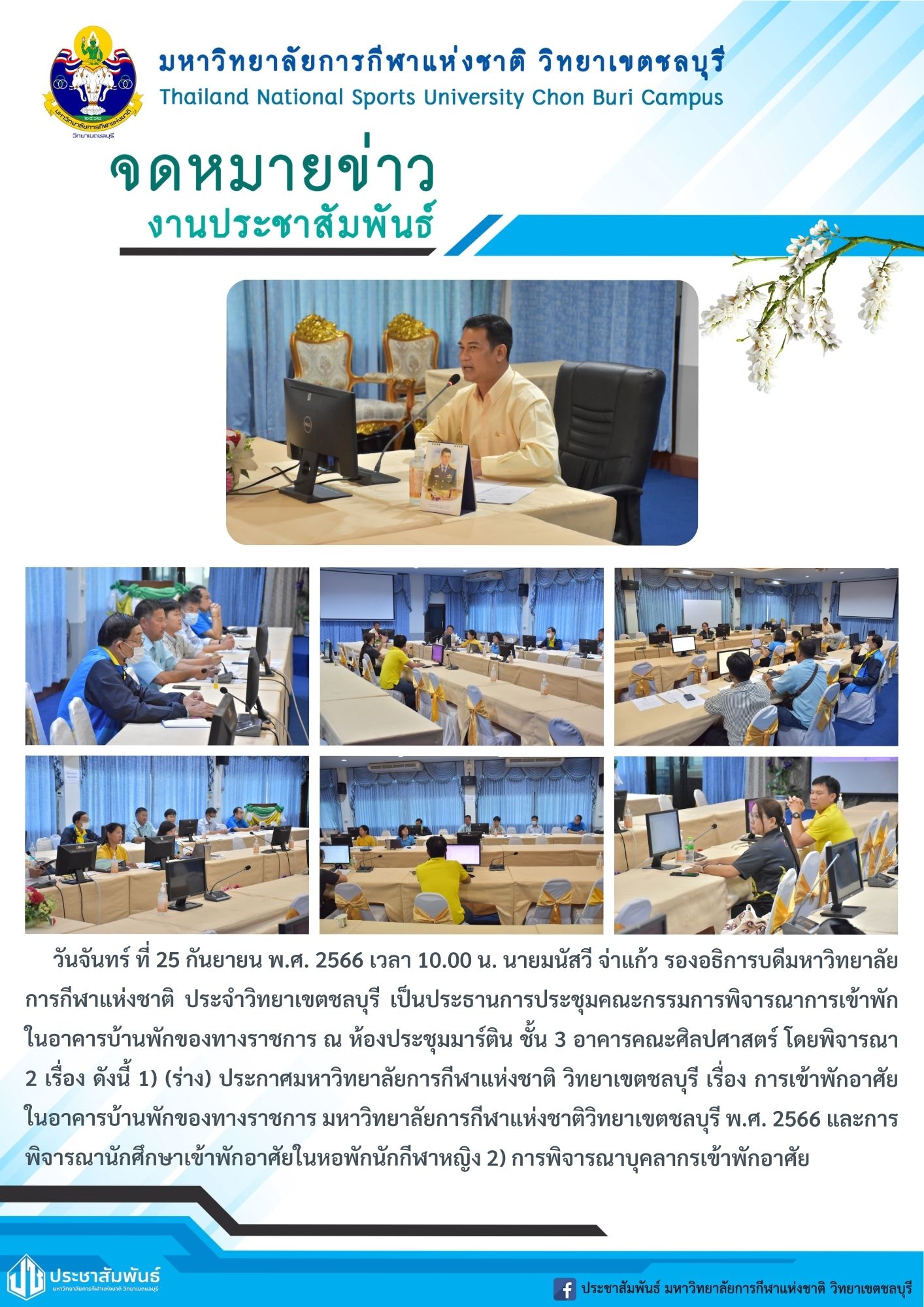วันจันทร์ ที่ 25 กันยายน พ.ศ. 2566 เวลา 10.00 น. นายมนัสวี จ่าแก้ว รองอธิการบดีมหาวิทยาลัยการกีฬาแห่งชาติ ประจำวิทยาเขตชลบุรี เป็นประธานการประชุมคณะกรรมการพิจารณาการเข้าพัก ในอาคารบ้านพักของทางราชการ ณ ห้องประชุมมาร์ติน ชั้น 3 อาคารคณะศิลปศาสตร์