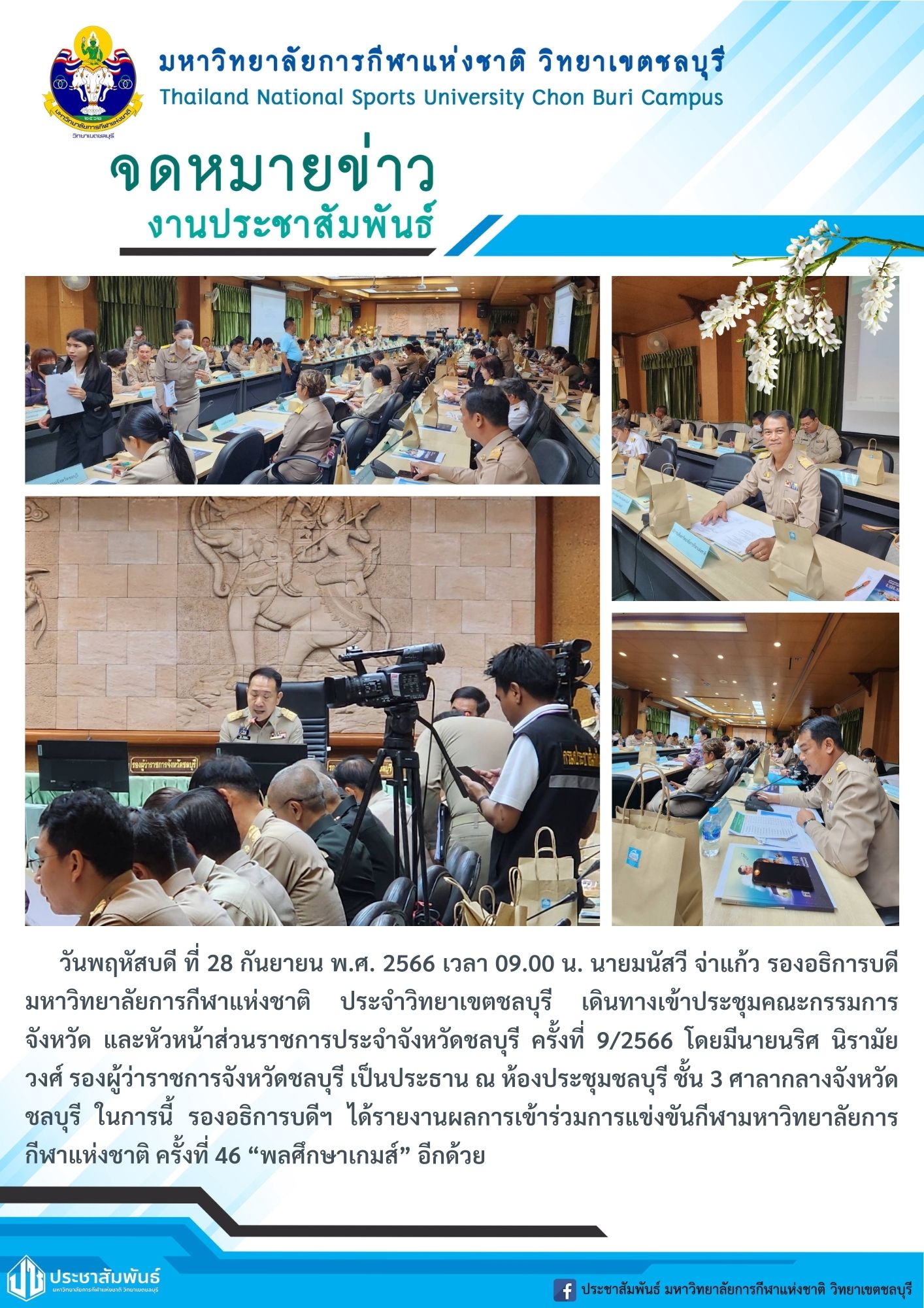 วันพฤหัสบดี ที่ 28 กันยายน พ.ศ. 2566 เวลา 09.00 น. นายมนัสวี จ่าแก้ว รองอธิการบดีมหาวิทยาลัยการกีฬาแห่งชาติ ประจำวิทยาเขตชลบุรี เดินทางเข้าประชุมคณะกรรมการจังหวัดและหัวหน้าส่วนราชการประจำจังหวัดชลบุรี ครั้งที่ 9/2566 โดยมีนายนริศ นิรามัยวงศ์ รองผู้ว่าราชการจังหวัดชลบุรี เป็นประธาน ณ ห้องประชุมชลบุรี ชั้น 3 ศาลากลางจังหวัด