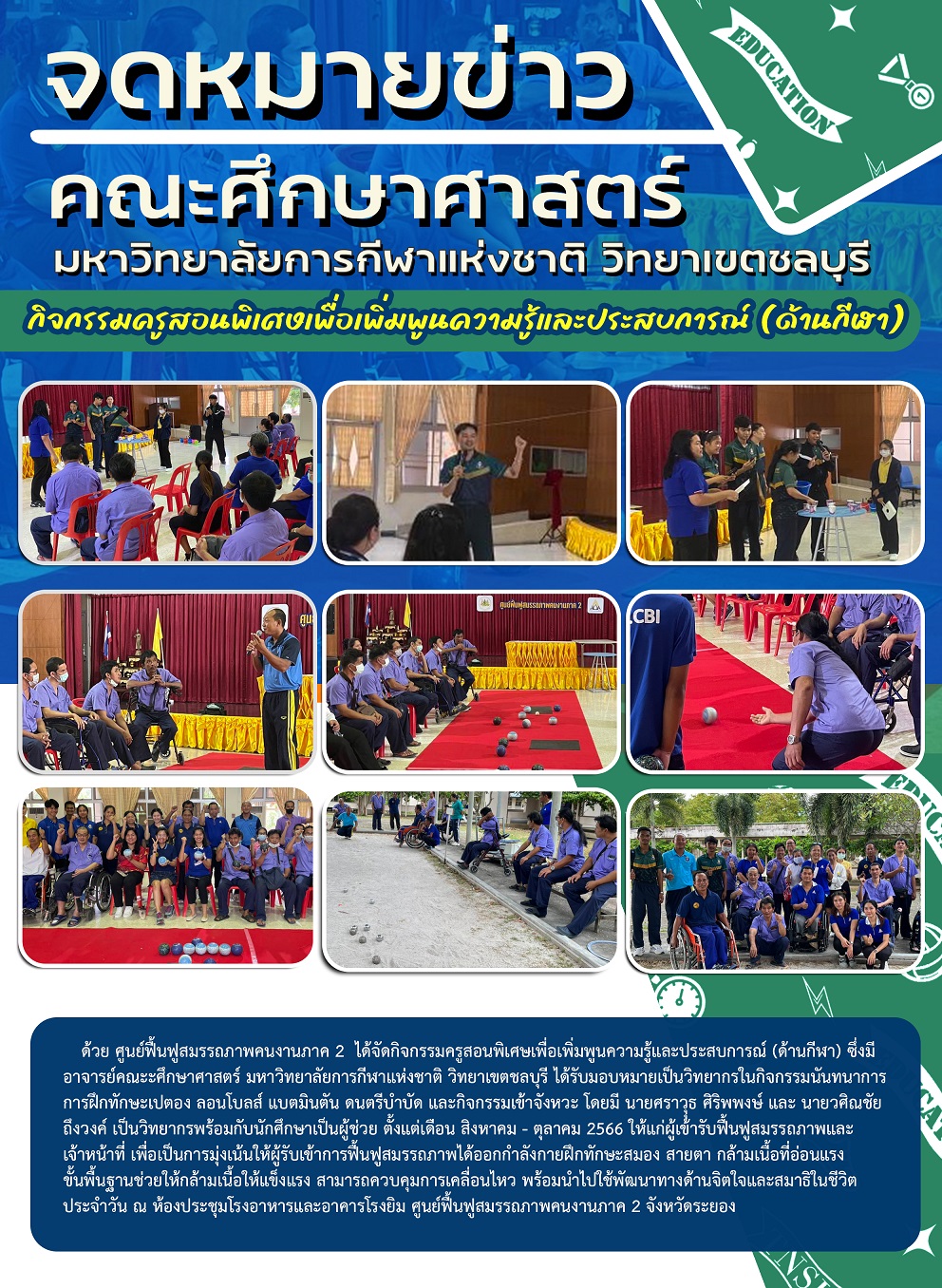 ด้วยศูนย์ฟื้นฟูสมรรถภาพคนงานภาค 2 ได้จัดกิจกรรมครูสอนพิเศษเพื่อเพิ่มพูนความรู้และประสบการณ์ด้านกีฬา ซึ่งมีอาจารย์คณะศึกษาศาสตร์ มหาวิทยาลัยการกีฬาแห่งชาติ วิทยาเขตชลบุรี ได้รับมอบหมายให้เป็นวิทยากรในการจัดกิจกรรม โดยมี นายศราวุธ ศิริพวษ์ และ นายวศิณชัย ถึงวงศ์ เป็นวิทยากร