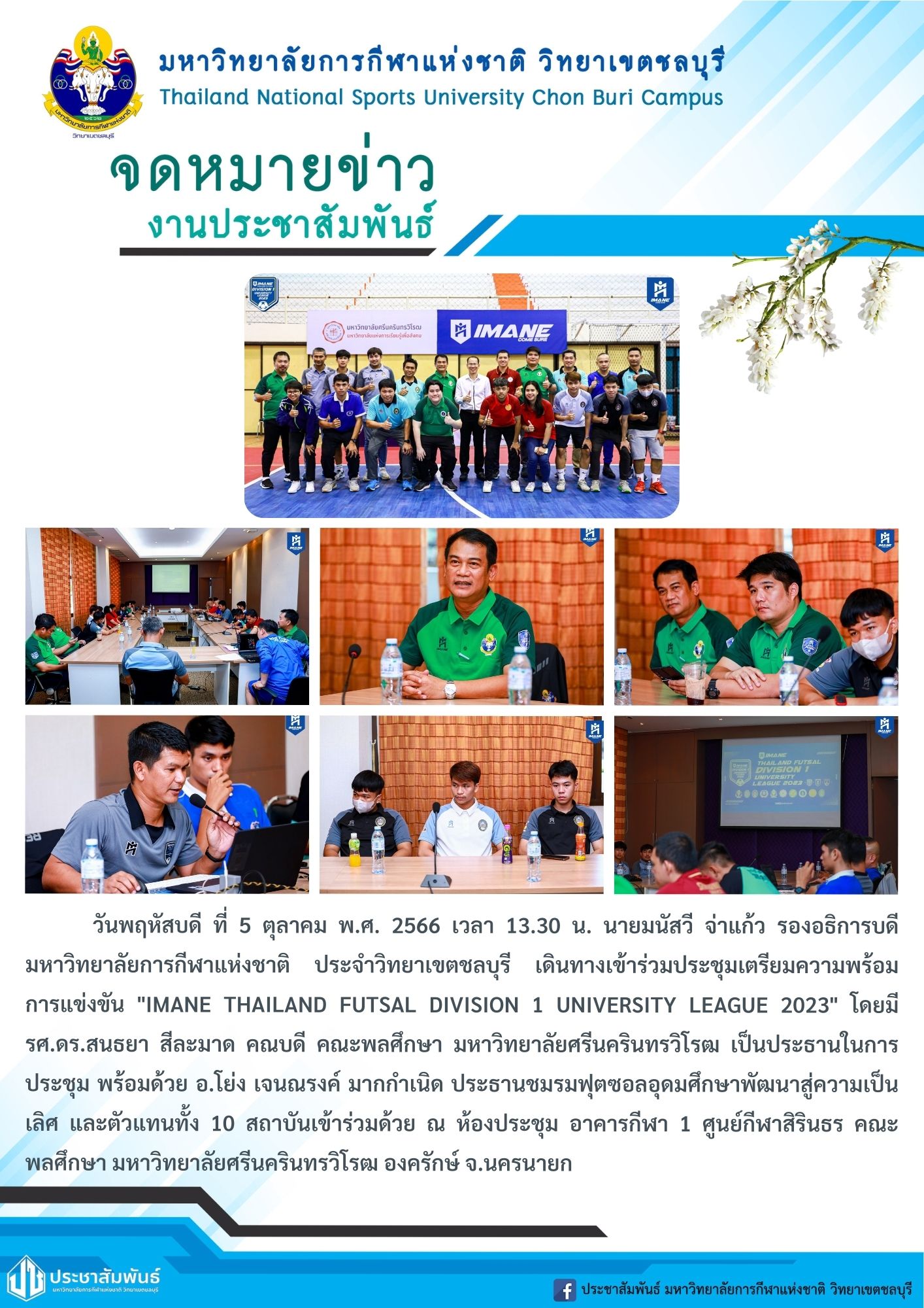 วันที่ 5 ตุลาคม พ.ศ. 2566 นายมนัสวี จ่าแก้ว รองอธิการบดีมหาวิทยาลัยการกีฬาแห่งชาติ ประจำวิทยาเขตชลบุรี เดินทางเข้าร่วมประชุมเตรียมความพร้อมการแข่งขัน IMANE THAILAND DUTSAL DIVISION 1 UNIVERSITY LEAGUE 2023 โดยมี รศ.ดร.สนธยา สีละมาด คณบดี คณะศึกษาศาสตร์ มหาวิทยาลัยศรีนครินวิโรฒ เป็นประธานในการประชุม