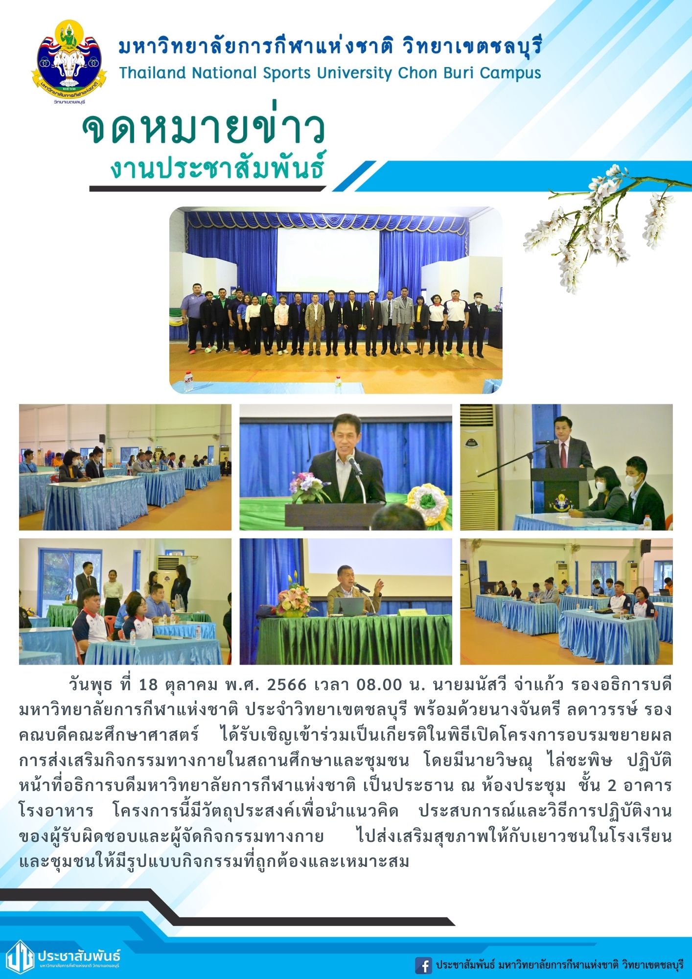 วันพุธ ที่ 18 ตุลาคม พ.ศ. 2566 เวลา 08.00 น. นายมนัสวี จ่าแก้ว รองอธิการบดี มหาวิทยาลัยการกีฬาแห่งชาติ ประจำวิทยาเขตชลบุรี พร้อมด้วยนางจันตรี ลดาวรรษ์ รอง คณบดีคณะศึกษาศาสตร์ ได้รับเชิญเข้าร่วมเป็นเกี่ยรติในพิธีเปิดโครงการอบรมขยายผล การส่งเสริมกิจกรรมทางกายในสถานศึกษาและชุมชน โดยมีนายวิษณุ ไล่ชะพิษ ปฏิบัติ หน้าที่อธิการบดีมหาวิทยาลัยการกีฬาแห่งชาติ เป็นประธาน