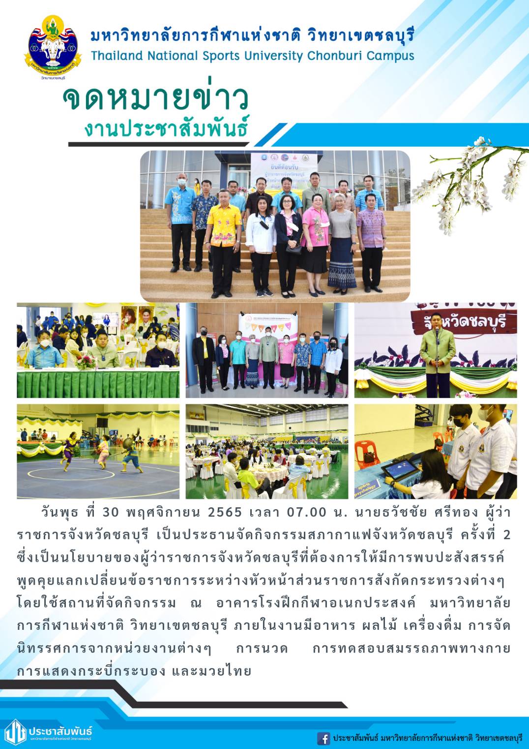 วันพุธ ที่ 30 พฤศจิกายน 2565 นายธวัชชัย ศรีทอง ผู้ว่าราชการจังหวัดชลบุรี เป็นประธานจัดกิจกรรมสภากาแฟจังหวัดชลบุรี ครั้งที่ 2 ซึ่งเป็นนโยบายของผู้ว่าราชการจังหวัดชลบุรีที่ต้องการให้มีการพบปะสังสรรค์แลกเปลี่ยนข้อราชการระหว่างหัวหน้าส่วนราชการสังกัดกระทรวงต่างๆ โดยใช้สถานที่จัดกิจกรรม ณ อาคารโรงฝึกกีฬาอเนกประสงค์ มหาวิทยาลัยการกีฬาแห่งชาติ วิทยาเขตชลบุรี