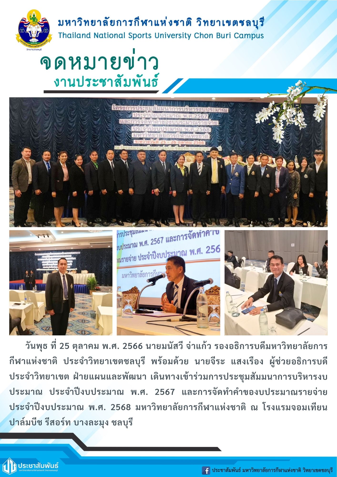 วันพุธ ที่ 25 ตุลาคม พ.ศ. 2566 นายมนัสวี จ่าแก้ว รองอธิการบดีมหาวิทยาลัยการ กีฬาแห่งชาติ ประจำวิทยาเขตชลบุรี พร้อมด้วย นายจีระ แสงเรือง ผู้ช่วยอธิการบดี ประจำวิทยาเขต ฝ่ายแผนและพัฒนา เดินทางเข้าร่วมการประชุมสัมมนาการบริหารงบ ประมาณ ประจำปีงบประมาณ พ.ศ. 2567 และการจัดทำคำของบประมาณรายจ่าย ประจำปีงบประมาณ พ.ศ. 2568 มหาวิทยาลัยการกีฬาแห่งชาติ ณ โรงแรมจอมเทียน ปาล์มบีช รีสอร์ท บางละมุง ชลบุรี