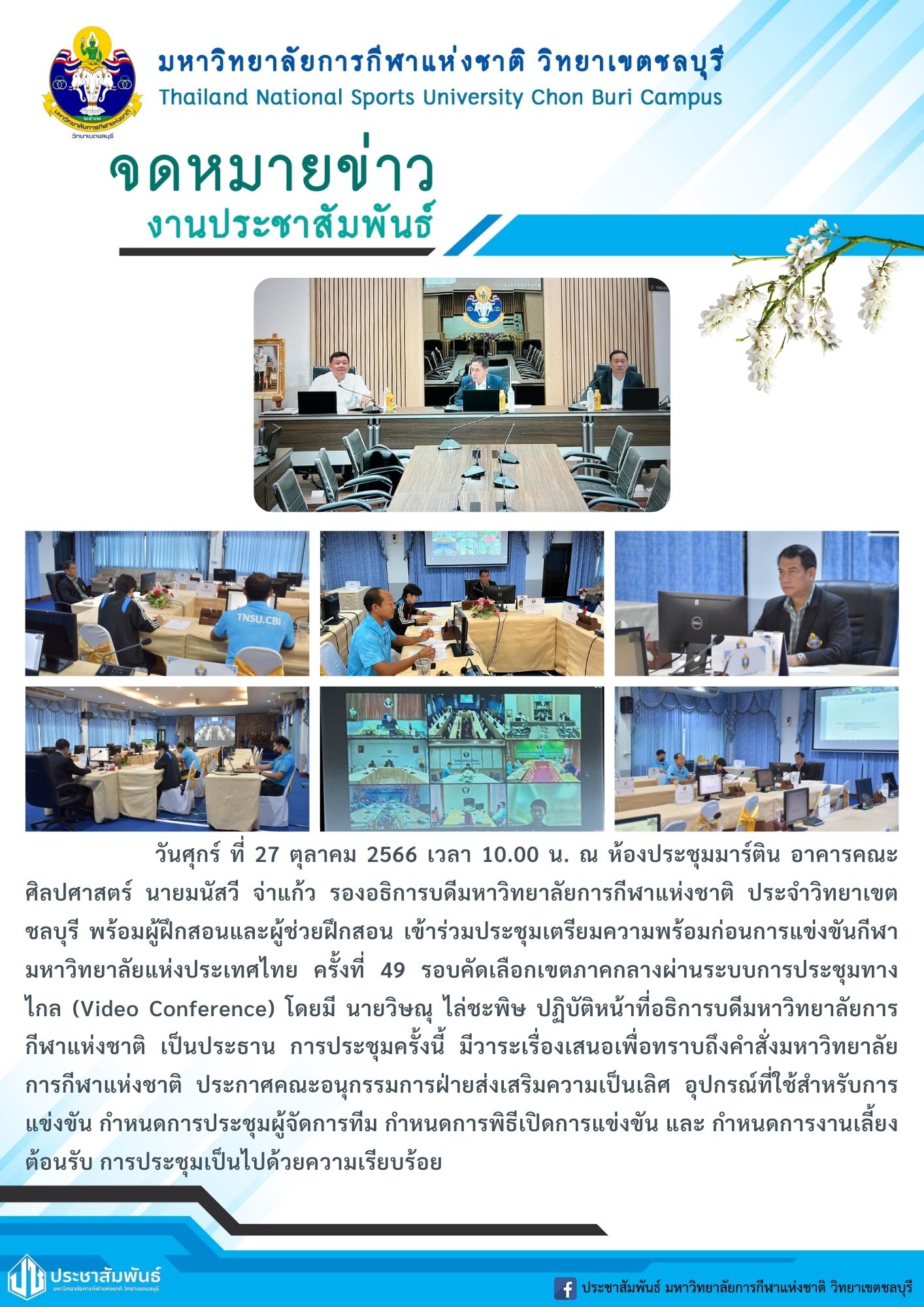 วันศุกร์ ที่ 27 ตุลาคม 2566 เวลา 10.00 น. ณ ห้องประชุมมาร์ติน อาคารคณะ ศิลปศาสตร์ นายมนัสวี จำาแก้ว รองอธิการบดีมหาวิทยาลัยการกีฬาแห่งชาติ ประจำวิทยาเขต ชลบุรี พร้อมผู้ฝึกสอนและผู้ช่วยฝึกสอน เข้าร่วมประชุมเตรียมความพร้อมก่อนการแข่งขันกีฬา มหาวิทยาลัยแห่งประเทศไทย ครั้งที่ 49 รอบคัดเลือกเขตภาคกลางผ่านระบบการประชุมทาง ไกล (Video Conference) โดยมี นายวิษณุ ไล่ชะพิษ ปฏิบัติหน้าที่อธิการบดีมหาวิทยาลัยการ กีฬาแห่งชาติ เป็นประธาน การประชุมครั้งนี้