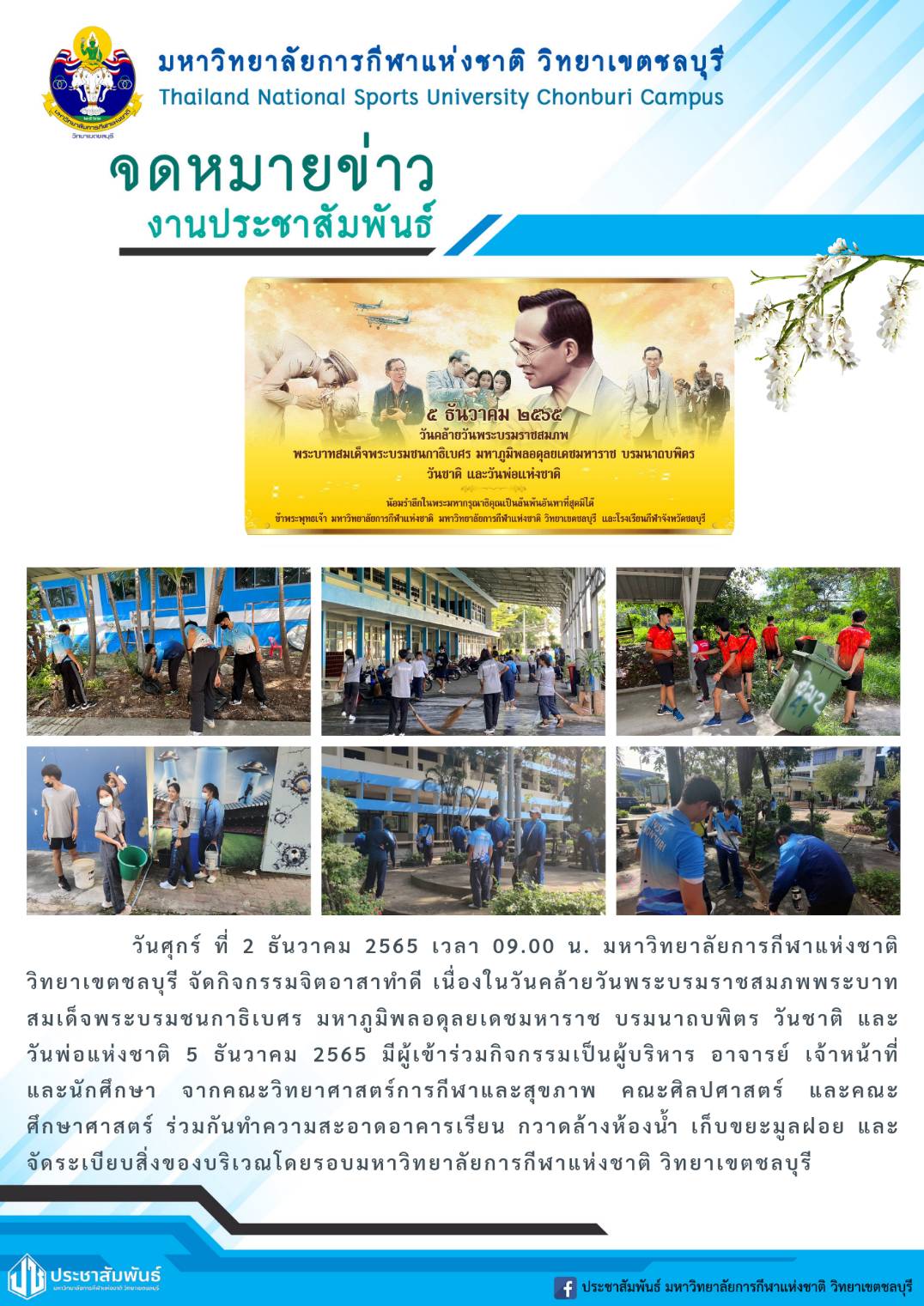 วันศุกร์ ที่ 2 ธันวาคม 2565 เวลา 09.00 น. มหาวิทยาลัยการกีฬาแห่งชาติ วิทยาเขตชลบุรี จัดกิจกรรมจิตอาสาทำดี เนื่องในวันคล้ายวันพระบรมราชสมภพ พระบาทสมเด็จพระบรมชนกาธิเบศร มหาภูมิพลอดุลยเดชมหาราช บรมนาถบพิตร วันชาติ และวันพ่อแห่งชาติ มีผู้เข้าร่วมกิจกรรมเป็นผู้บริหาร อาจารย์ เจ้าหน้าที่ และนักศึกษา จากคณะวิทยาศาสตร์การกีฬาและสุขภาพ คณะศิลปศาสตร์ และคณะศึกษาศาสตร์