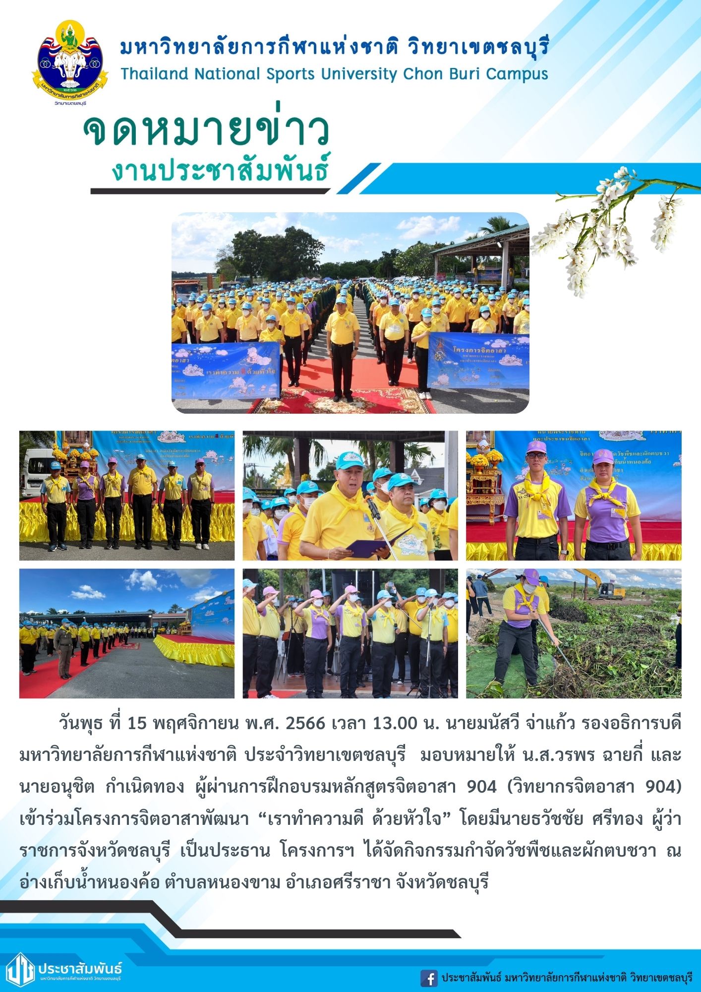 วันพุธ ที่ 15 พฤศจิกายน พ.ศ. 2566 เวลา 13.00 น. นายมนัสวี จ่าแก้ว รองอธิการบดี มหาวิทยาลัยการกีฬาแห่งชาติ ประจำวิทยาเขตชลบุรี มอบหมายให้ น.ส.วรพร ฉายกี่ และ นายอนุชิต กำเนิดทอง ผู้ผ่านการฝึกอบรมหลักสูตรจิตอาสา 904 (วิทยากรจิตอาสา 904) เข้าร่วมโครงการจิตอาสาพัฒนา "เราทำความดี ด้วยหัวใจ" โดยมีนายธวัชชัย ศรีทอง ผู้ว่า ราชการจังหวัดชลบุรี เป็นประธาน โครงการฯ.jpg)