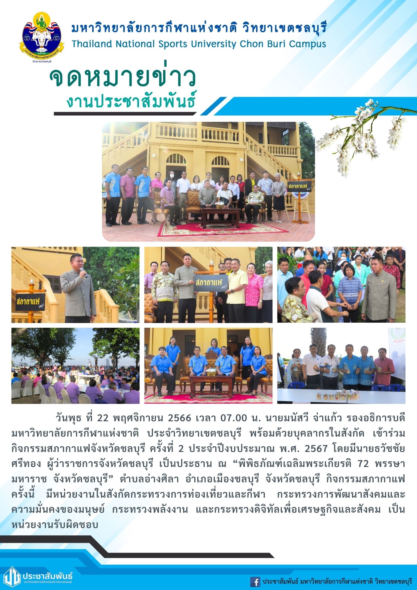 วันพุธ ที่ 22 พฤศจิกายน 2566 เวลา 07.00 น. นายมนัสวี จ่าแก้ว รองอธิการบดี มหาวิทยาลัยการกีฬาแห่งชาติ ประจำวิทยาเขตชลบุรี พร้อมด้วยบุคลากรในสังกัด เข้าร่วม กิจกรรมสภากาแฟจังหวัดชลบุรี ครั้งที่ 2 ประจำปีงบประมาณ พ.ศ. 2567 โดยมีนายธวัชชัย ศรีทอง ผู้ว่าราชการจังหวัดชลบุรี เป็นประธาน ณ พิพิธภัณฑ์เฉลิมพระเกียรติ 72 พรรษา มหาราช จังหวัดชลบุรี