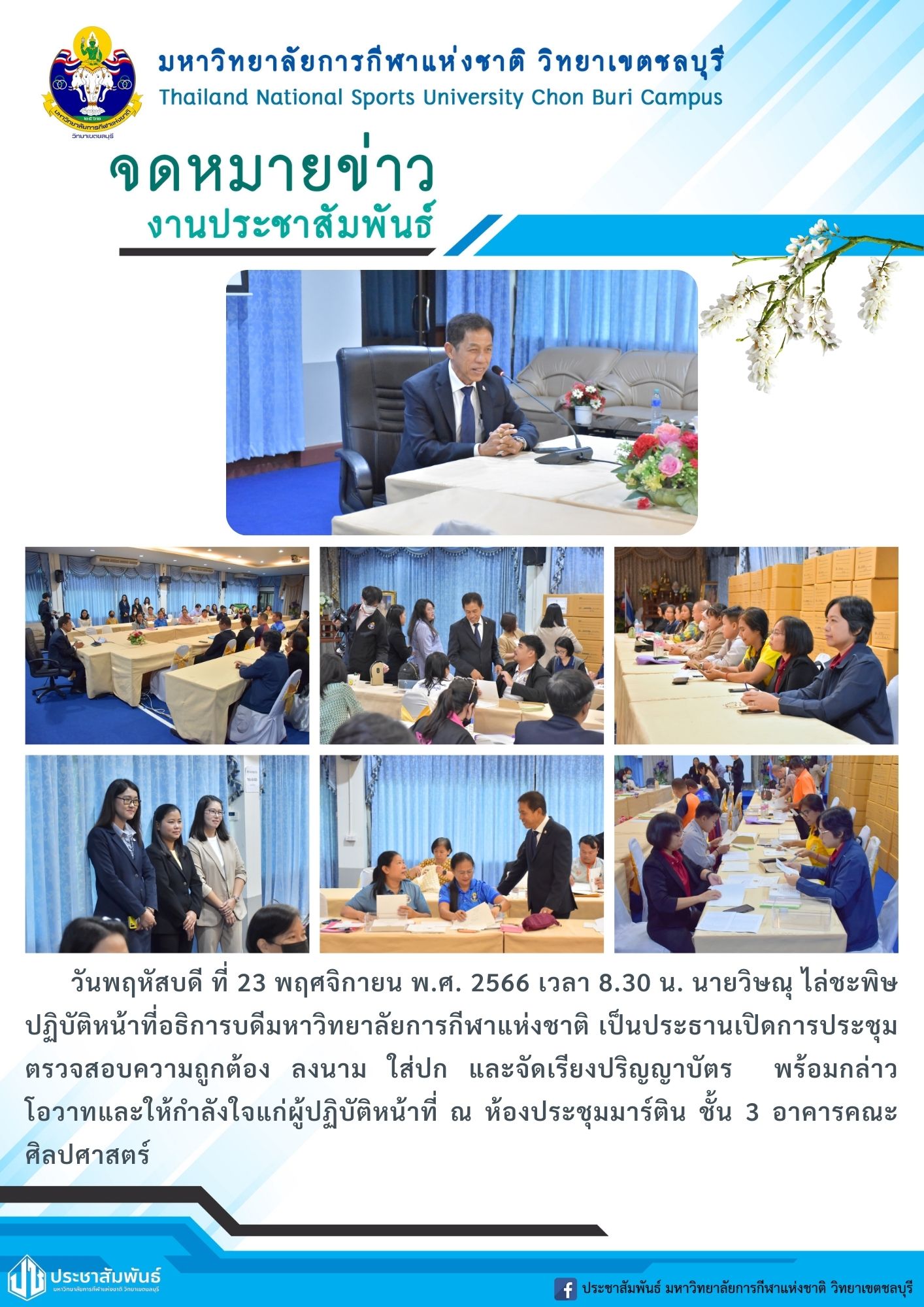 วันพฤหัสบดี ที่ 23 พฤศจิกายน พ.ศ. 2566 เวลา 8.30 น. นายวิษณุ ไล่ชะพิษ ปฏิบัติหน้าที่อธิการบดีมหาวิทยาลัยการกีฬาแห่งชาติ เป็นประธานเปิดการประชุม ตรวจสอบความถูกต้อง ลงนาม ใส่ปก และจัดเรียงปริญญาบัตร พร้อมกล่าว โอวาทและให้กำลังใจแก่ผู้ปฏิบัติหน้าที่