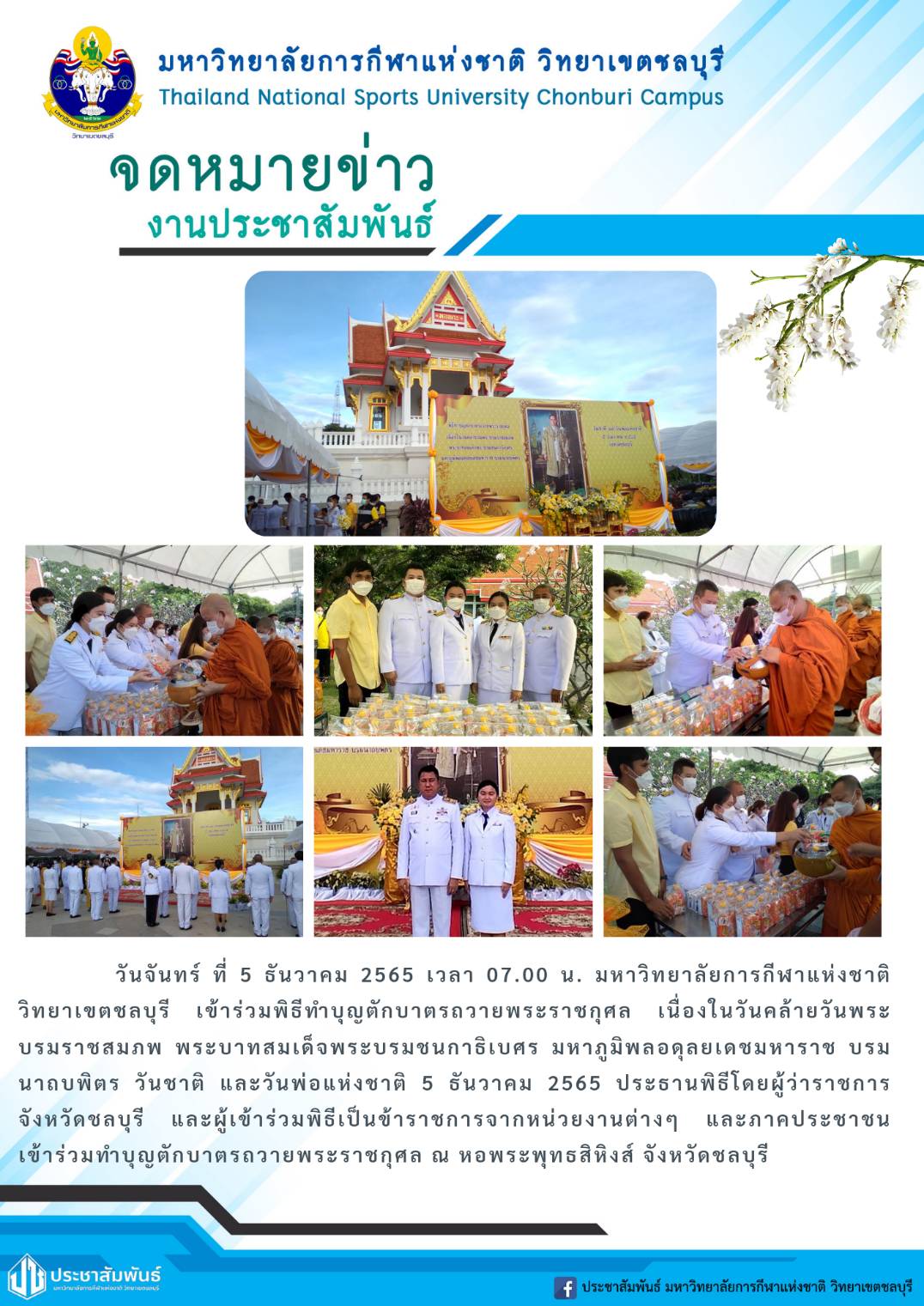วันจันทร์ ที่ 5 ธันวาคม 2565 เวลา 07.00 น. มหาวิทยาลัยการกีฬาแห่งชาติ วิทยาเขตชลบุรี เข้าร่วมพิธีทำบุญตักบาตรถวายพระราชกุศล เนื่องในวันบรมราชสมภพ พระบาทสมเด็จพระบรมชนกาธิเบศร มหาภูมิพลอดุลยเดชมหาราช บรมนาถบพิตร วันชาติ และวันพ่อแห่งชาติ 5 ธันวาคม 2565 ประธานในพิธีโดยผู้ว่าราชการจังหวัดชลบุรี ณ หอพระพุทธสิหิงส์ จังหวัดชลบุรี