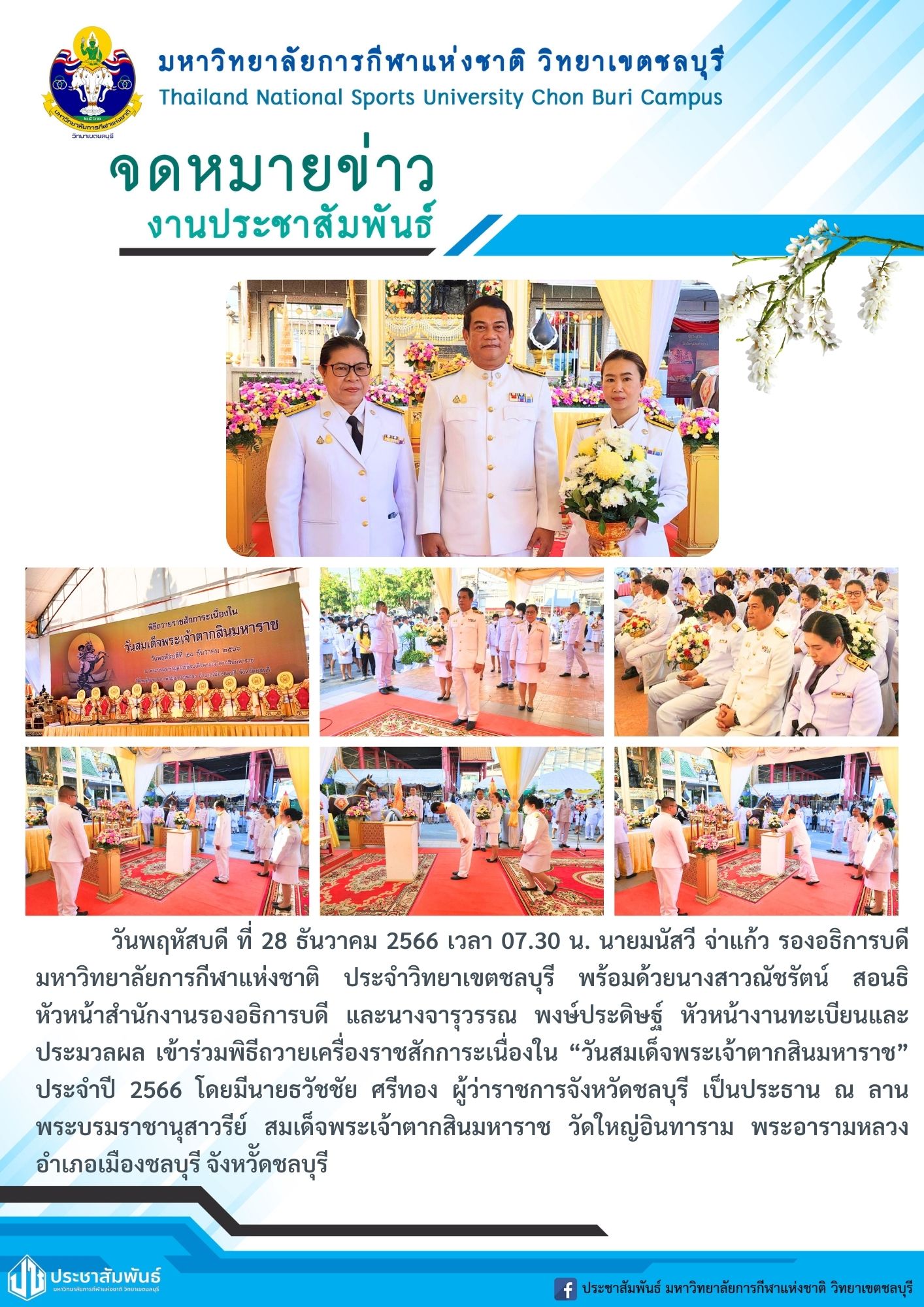 วันพฤหัสบดี ที่ 28 ธันวาคม 2566 เวลา 07.30 น. นายมนัสวี จ่าแก้ว รองอธิการบดี มหาวิทยาลัยการกีฬาแห่งชาติ ประจำวิทยาเขตชลบุรี พร้อมด้วยนางสาวณัชรัตน์ สอนธิ หัวหน้าสำนักงานรองธิการบดี และนางจารุวรรณ พงษ์ประดิษฐ์ หัวหน้างานทะเบียนและ ประมวลผล เข้าร่วมพิธีถวายเครื่องราชสักการะเนื่องใน "วันสมเด็จพระเจ้าตากสินมหาราช" ประจำปี 2566 โดยมีนายธวัชชัย ศรีทอง ผู้ว่าราชการจังหวัดชลบุรี เป็นประธาน ณ ลาน พระบรมราชานุสาวรีย์ สมเด็จพระเจ้าตากสินมหาราช วัดใหญ่อินทาราม