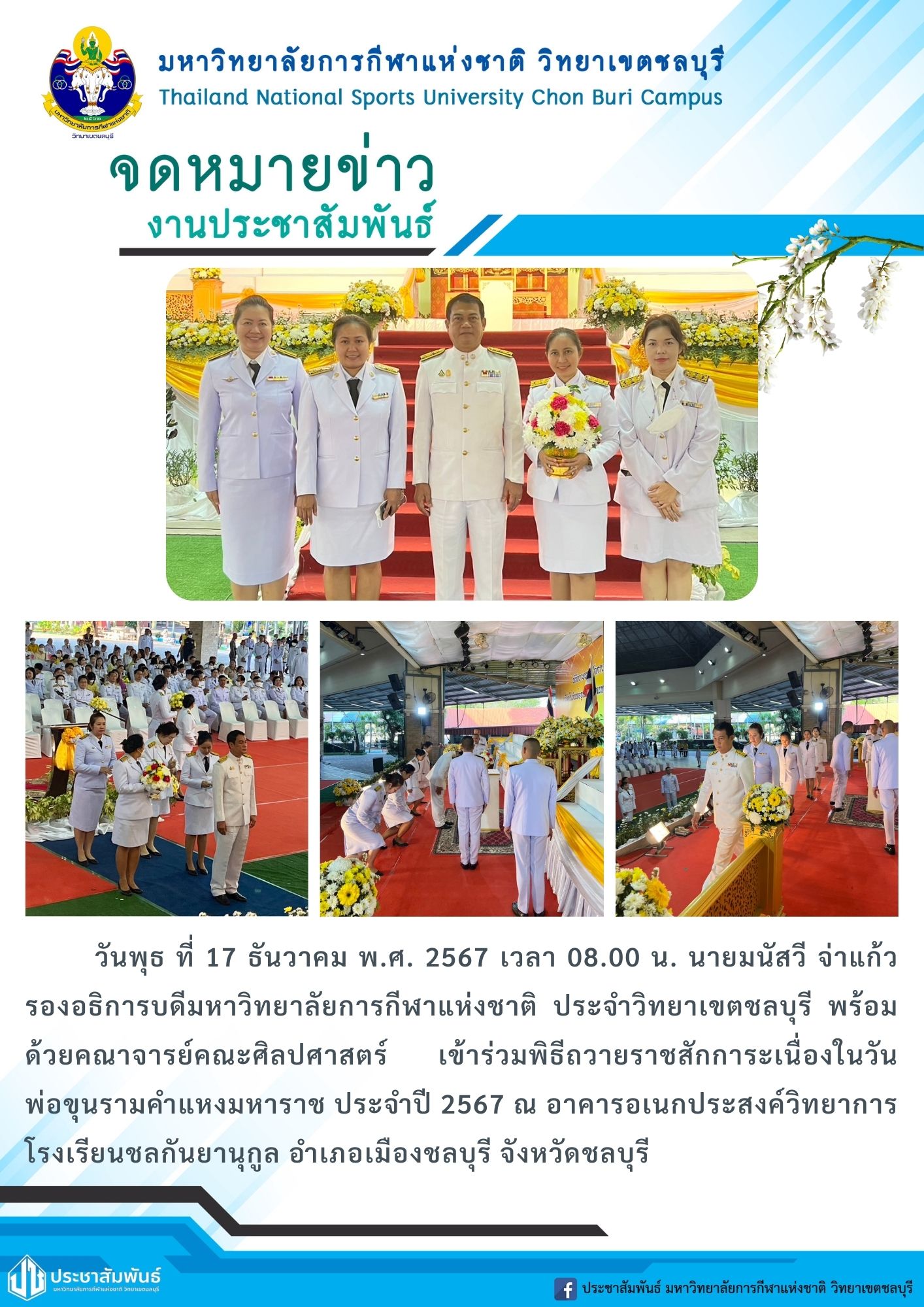 วันพุธ ที่ 17 ธันวาคม พ.ศ. 2567 เวลา 08.00 น. นายมนัสวี จ่าแก้ว รองอธิการบดีมหาวิทยาลัยการกีฬาแห่งชาติ ประจำวิทยาเขตชลบุรี พร้อม ด้วยคณาจารย์คณะศิลปศาสตร์เข้าร่วมพิธีถวายราชสักการะเนื่องในวัน พ่อขุนรามคำแหงมหาราช ประจำปี 2567 ณ อาคารอเนกประสงค์วิทยาการ โรงเรียนชลกันยานุกูล อำเภอเมืองชลบุรี จังหวัดชลบุรี