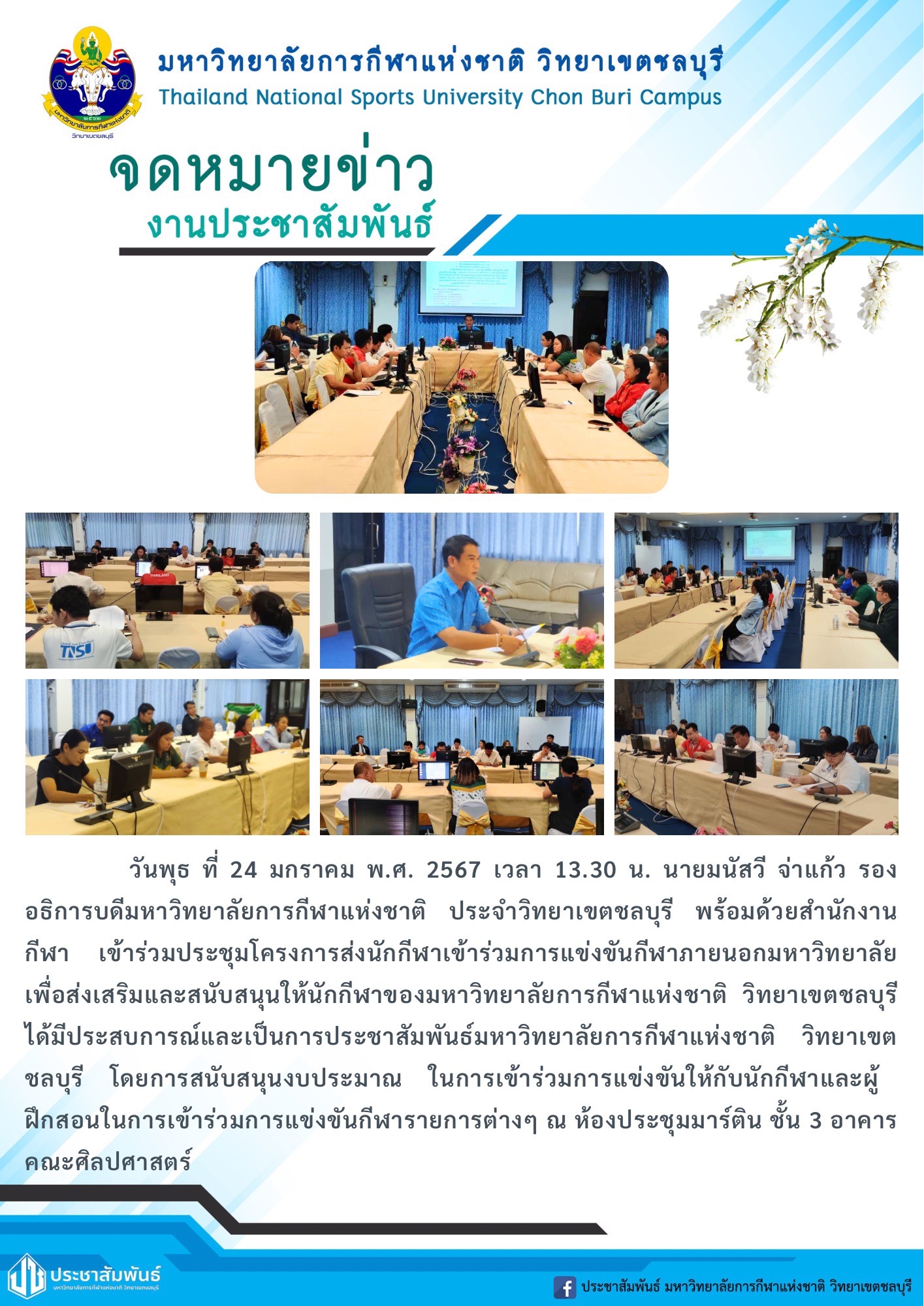 วันพุธ ที่ 31 มกราคม พ.ศ. 2567 เวลา 13.30 น. นายมนัสวี จ่าแก้ว รองอธิการบดีมหาวิทยาลัยการกีฬาแห่งชาติ ประจำวิทยาเขตชลบุรี เป็นประธานการประชุมกำหนดแนวทางในการยืนยันสิทธิเข้าศึกษาและรายงานตัว นักศึกษาใหม่ ระดับปริญญาตรี ประเภททั่วไป ประจำปีการศึกษา 2567 เพื่อกำกับติดตามการดำเนินงานให้เป็นไปด้วยความเรียบร้อย ณ ห้องประชุม 121/1 ชั้น 2 อาคารคณะศิลปศาสตร์