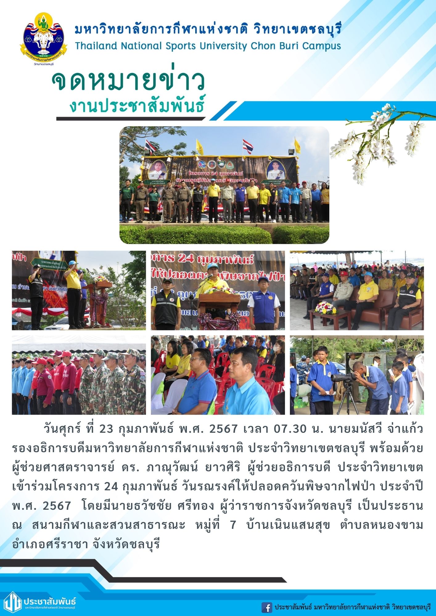 วันศุกร์ ที่ 23 กุมภาพันธ์ พ.ศ. 2567 เวลา 07.30 น. นายมนัสวี จ่าแก้ว รองอธิการบดีมหาวิทยาลัยการกีฬาแห่งชาติ ประจำวิทยาเขตชลบุรี พร้อมด้วย ผู้ช่วยศาสตราจารย์ ดร. ภาณุวัฒน์ ยาวศิริ ผู้ช่วยอธิการบดี ประจำวิทยาเขต เข้าร่วมโครงการ 24 กุมภาพันธ์ วันรณรงค์ให้ปลอดควันพิษจากไฟป่า ประจำปี พ.ศ. 2567 โดยมีนายธวัชชัย ศรีทอง ผู้ว่าราชการจังหวัดชลบุรี เป็นประธาน ณ สนามกีฬาและสวนสาธารณะ หมู่ที่ 7 บ้านเนินแสนสุข ตำบลหนองขาม อำเภอศรีราชา จังหวัดชลบุรี