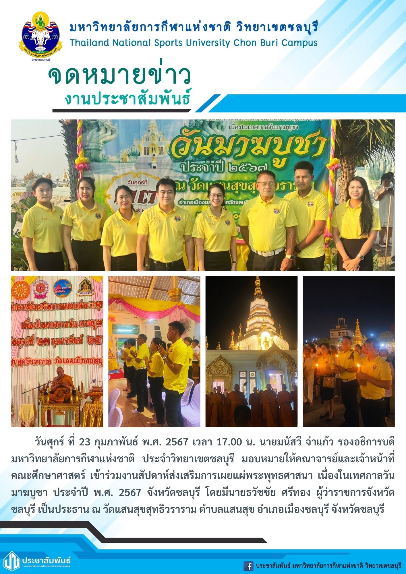 วันศุกร์ ที่ 23 กุมภาพันธ์ พ.ศ. 2567 เวลา 17.00 น. นายมนัสวี จ่าแก้ว รองอธิการบดีมหาวิทยาลัยการกีฬาแห่งชาติ ประจำวิทยาเขตชลบุรี มอบหมายให้คณาจารย์และเจ้าหน้าที่คณะศึกษาศาสตร์ เข้าร่วมงานสัปดาห์ส่งเสริมการเผยแผ่พระพุทธศาสนา เนื่องในเทศกาลวันมาฆบูชา ประจำปี พ.ศ. 2567 จังหวัดชลบุรี โดยมีนายธวัชชัย ศรีทอง ผู้ว่าราชการจังหวัดชลบุรี เป็นประธาน ณ วัดแสนสุขสุทธิวราราม ตำบลแสนสุข อำเภอเมืองชลบุรี จังหวัดชลบุรี