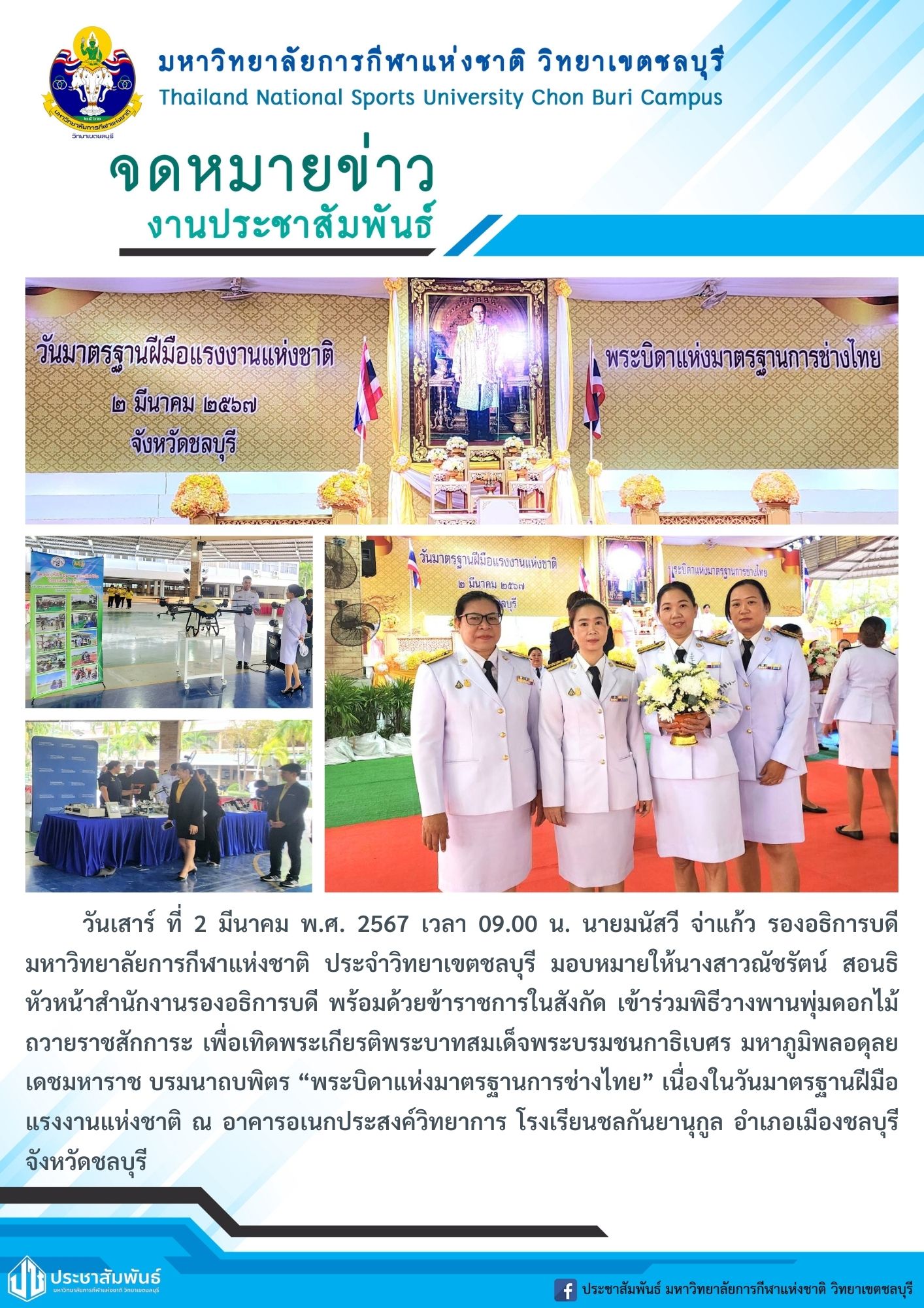 วันเสาร์ ที่ 2 มีนาคม พ.ศ. 2567 เวลา 09.00 น. นายมนัสวี จ่าแก้ว รองอธิการบดีมหาวิทยาลัยการกีฬาแห่งชาติ ประจำวิทยาเขตชลบุรี มอบหมายให้นางสาวณัชรัตน์ สอนธิ หัวหน้าสำนักงานรองอธิการบดี พร้อมด้วยข้าราชการในสังกัด เข้าร่วมพิธีวางพานพุ่มดอกไม้ถวายราชสักการะ เพื่อเทิดพระเกียรติพระบาทสมเด็จพระบรมชนกาธิเบศร มหาภูมิพลอดุลยเดชมหาราช บรมนาถบพิตร “พระบิดาแห่งมาตรฐานการช่างไทย” เนื่องในวันมาตรฐานฝีมือแรงงานแห่งชาติ ณ อาคารอเนกประสงค์วิทยาการ โรงเรียนชลกันยานุกูล อำเภอเมืองชลบุรี จังหวัดชลบุรี