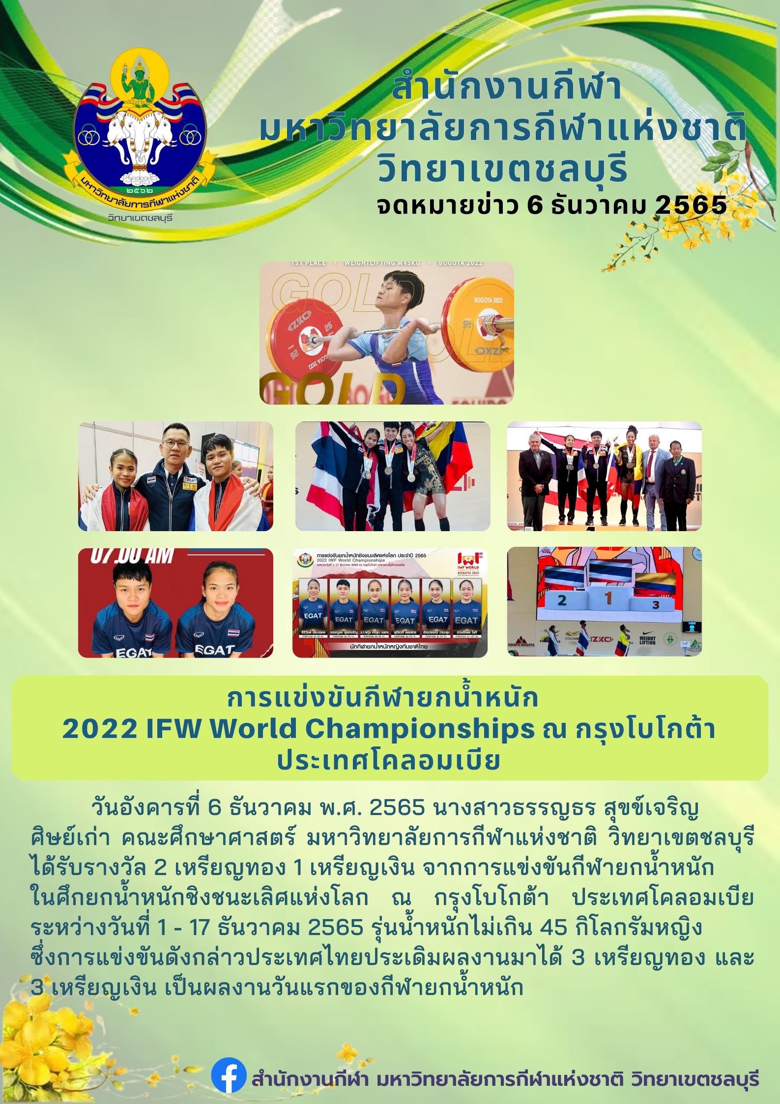 นางสาวธรรญธร สุขข์เจริญ ศิษย์เก่า คณะศึกษาศาสตร์ มหาวิทยาลัยการกีฬาแห่งชาติ วิทยาเขตชลบุรี ได้รับรางวัล 2 เหรียญทอง 1 เหรียญเงิน จากการแข่งขันกีฬายกน้ำหนัก ในศึกยกน้ำหนักชิงชนะเลิศแห่งโลก ณ กรุงโบโกต้า ประเทศโคลอมเบีย ระหว่างวันที่ 1 - 17 ธันวาคม 2565 รุ่นน้ำหนักไม่เกิน 45 กิโลกรัมหญิง