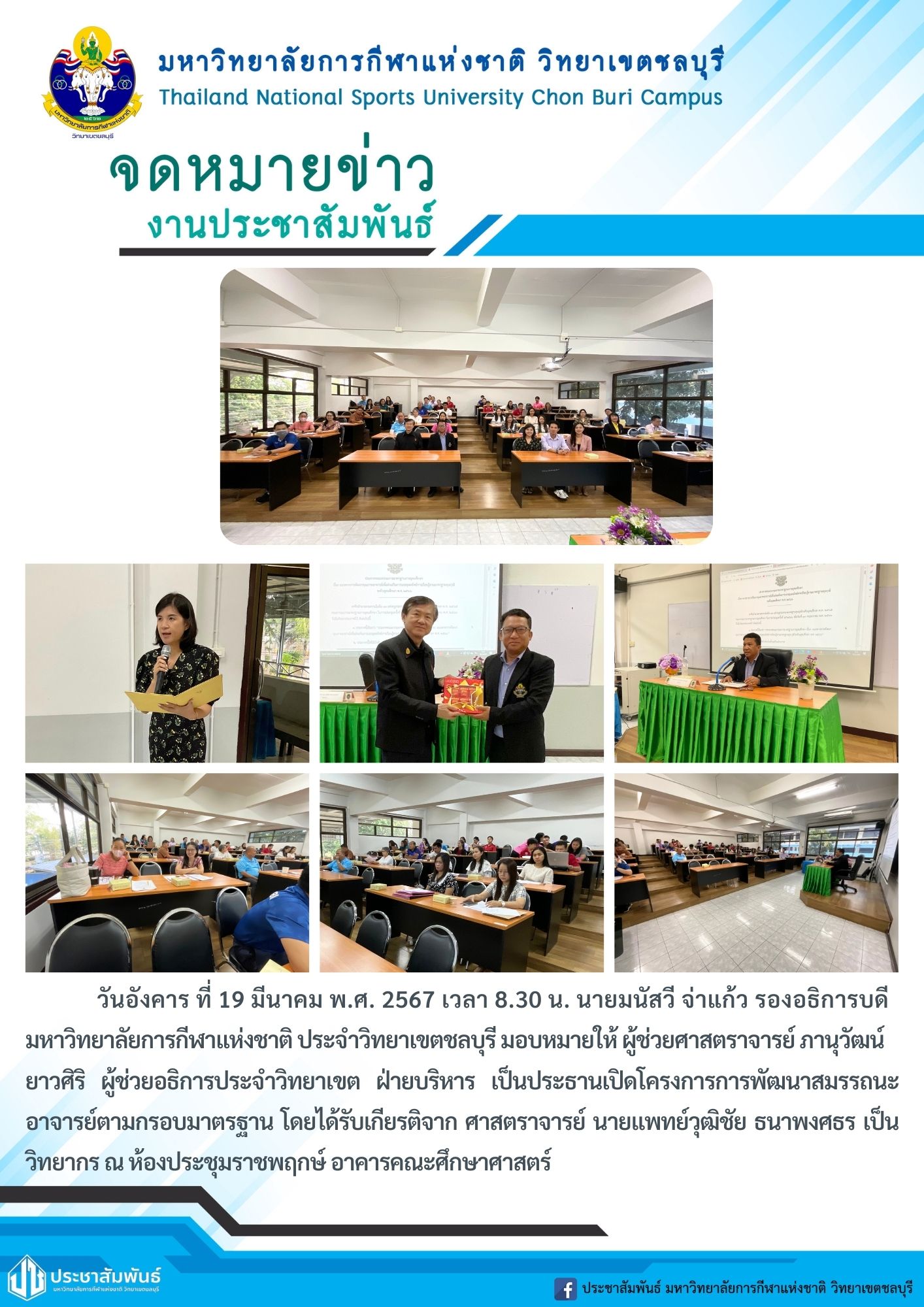 วันอังคาร ที่ 19 มีนาคม พ.ศ. 2567 เวลา 8.30 น. นายมนัสวี จ่าแก้ว รองอธิการบดีมหาวิทยาลัยการกีฬาแห่งชาติ ประจำวิทยาเขตชลบุรี มอบหมายให้ ผู้ช่วยศาสตราจารย์ ภานุวัฒน์ ยาวศิริ ผู้ช่วยอธิการประจำวิทยาเขต ฝ่ายบริหาร เป็นประธานเปิดโครงการการพัฒนาสมรรถนะอาจารย์ตามกรอบมาตรฐาน โดยได้รับเกียรติจาก ศาสตราจารย์ นายแพทย์วุฒิชัย ธนาพงศธร เป็นวิทยากร ณ ห้องประชุมราชพฤกษ์ อาคารคณะศึกษาศาสตร์