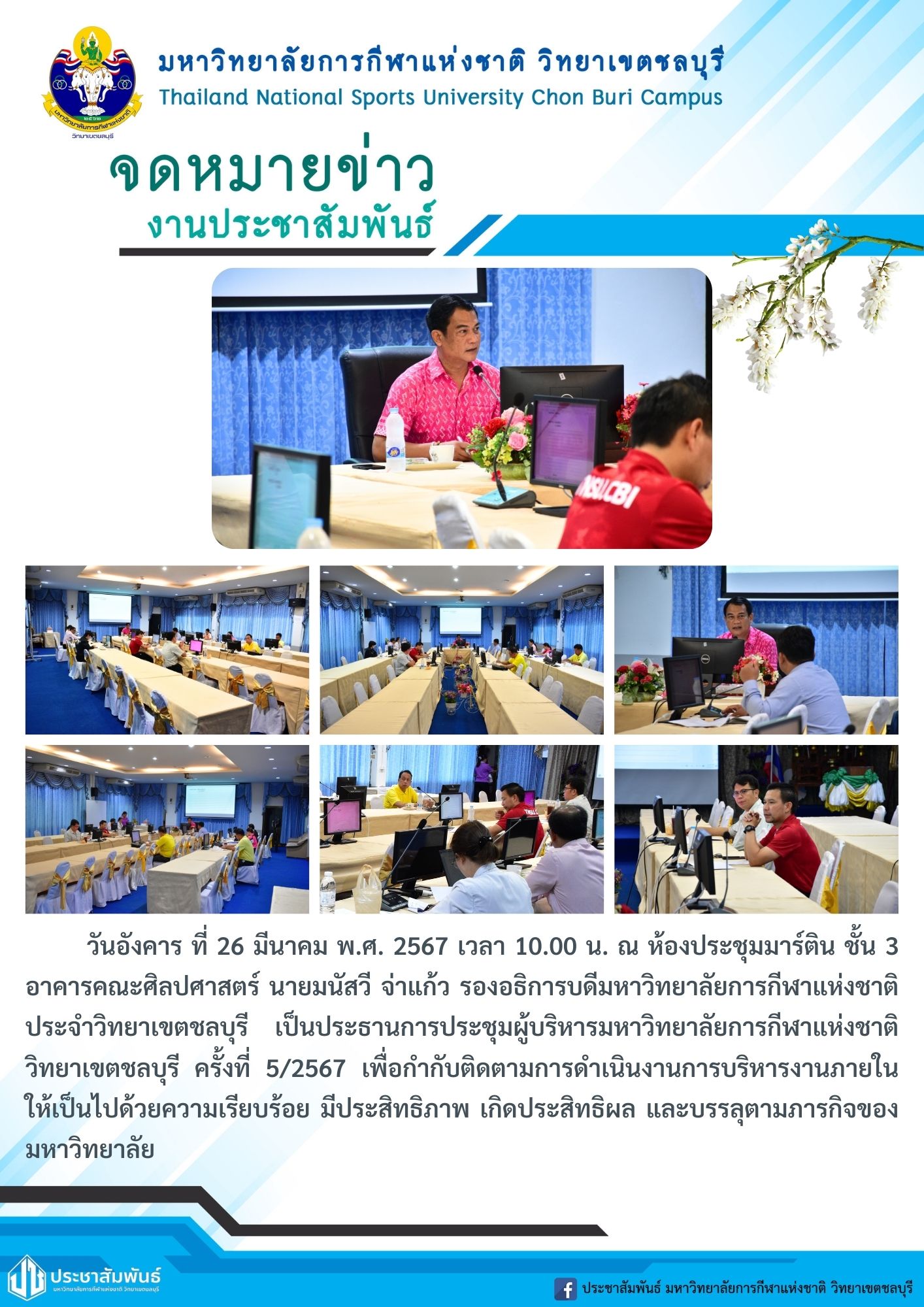 วันอังคาร ที่ 26 มีนาคม พ.ศ. 2567 เวลา 10.00 น. ณ ห้องประชุมมาร์ติน ชั้น 3 อาคารคณะศิลปศาสตร์ นายมนัสวี จ่าแก้ว รองอธิการบดีมหาวิทยาลัยการกีฬาแห่งชาติ ประจำวิทยาเขตชลบุรี เป็นประธานการประชุมผู้บริหารมหาวิทยาลัยการกีฬาแห่งชาติ วิทยาเขตชลบุรี ครั้งที่ 5/2567 เพื่อกำกับติดตามการดำเนินงานการบริหารงานภายใน ให้เป็นไปด้วยความเรียบร้อย มีประสิทธิภาพ เกิดประสิทธิผล และบรรลุตามภารกิจของมหาวิทยาลัย