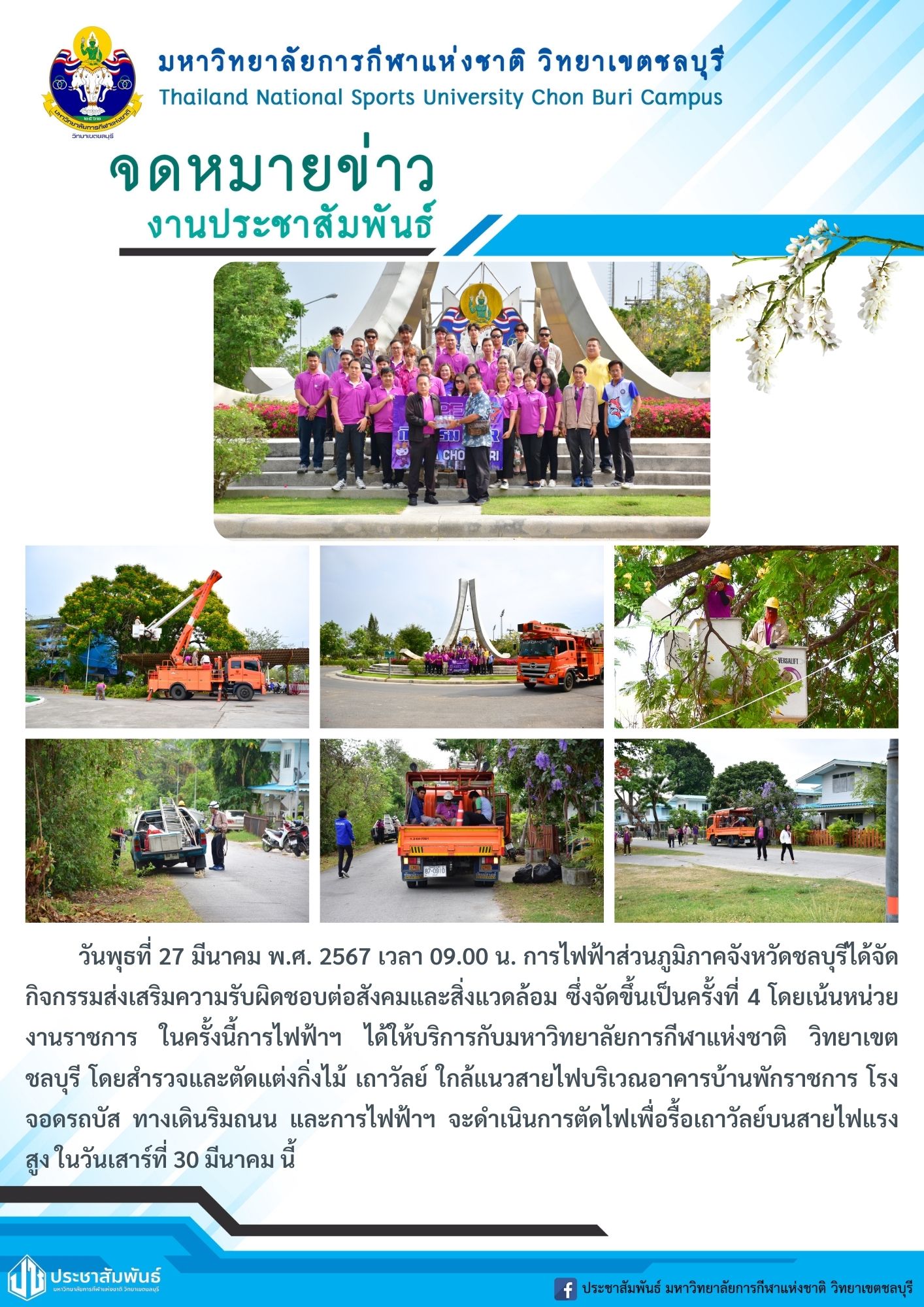 วันพุธที่ 27 มีนาคม พ.ศ. 2567 เวลา 09.00 น. การไฟฟ้าส่วนภูมิภาคจังหวัดชลบุรีได้จัดกิจกรรมส่งเสริมความรับผิดชอบต่อสังคมและสิ่งแวดล้อม ซึ่งจัดขึ้นเป็นครั้งที่ 4 โดยเน้นหน่วยงานราชการ ในครั้งนี้การไฟฟ้าฯ ได้ให้บริการกับมหาวิทยาลัยการกีฬาแห่งชาติ วิทยาเขตชลบุรี โดยสำรวจและตัดแต่งกิ่งไม้ เถาวัลย์ ใกล้แนวสายไฟบริเวณอาคารบ้านพักราชการ โรงจอดรถบัส ทางเดินริมถนน และการไฟฟ้าฯ จะดำเนินการตัดไฟเพื่อรื้อเถาวัลย์บนสายไฟแรงสูง ในวันเสาร์ที่ 30 มีนาคม นี้