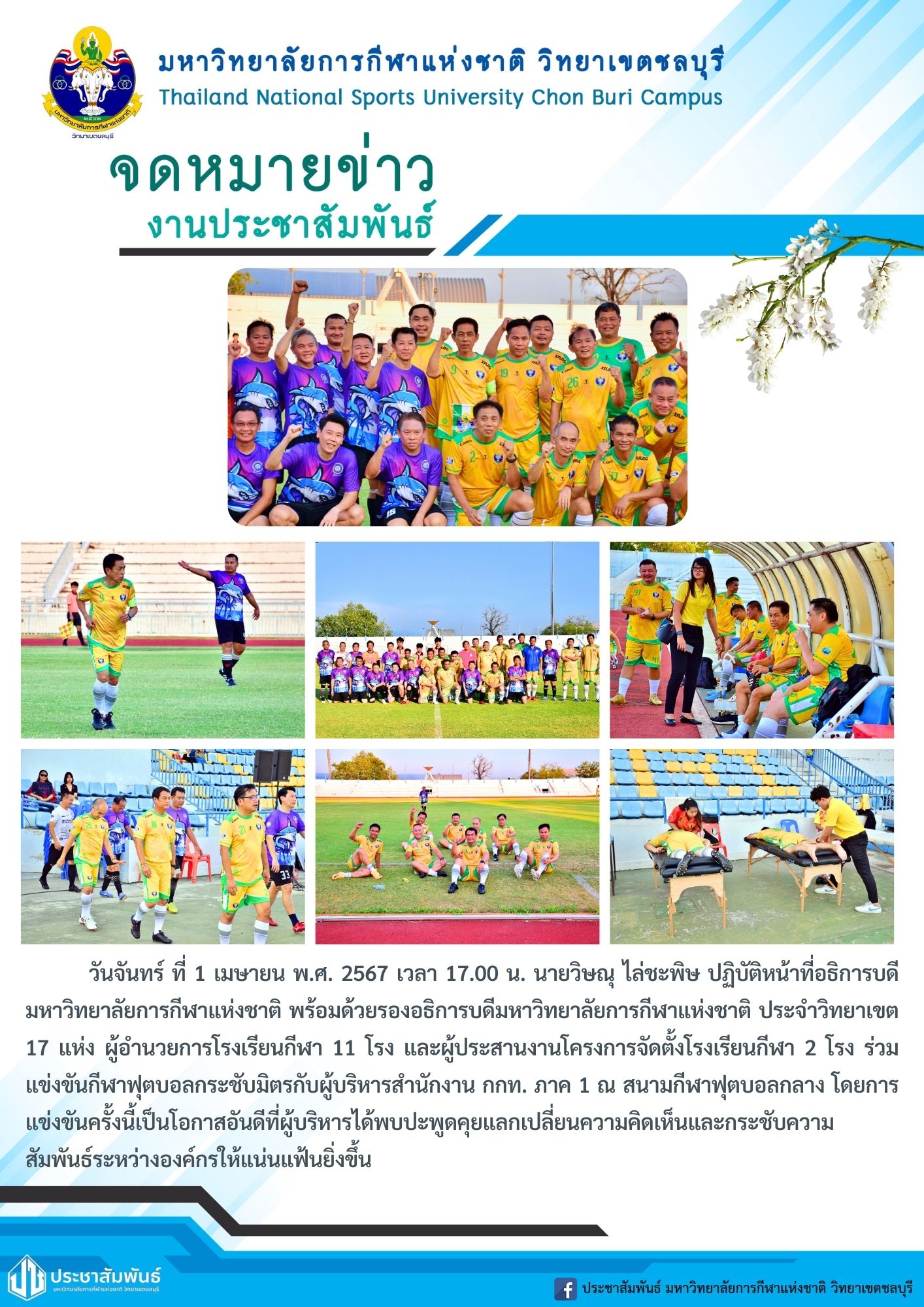วันจันทร์ ที่ 1 เมษายน พ.ศ. 2567 เวลา 17.00 น. นายวิษณุ ไล่ชะพิษ ปฏิบัติหน้าที่อธิการบดีมหาวิทยาลัยการกีฬาแห่งชาติ พร้อมด้วยรองอธิการบดีมหาวิทยาลัยการกีฬาแห่งชาติ ประจำวิทยาเขต 17 แห่ง ผู้อำนวยการโรงเรียนกีฬา 11 โรง และผู้ประสานงานโครงการจัดตั้งโรงเรียนกีฬา 2 โรง ร่วมแข่งขันกีฬาฟุตบอลกระชับมิตรกับผู้บริหารสำนักงาน กกท. ภาค 1 ณ สนามกีฬาฟุตบอลกลาง โดยการแข่งขันครั้งนี้เป็นโอกาสอันดีที่ผู้บริหารได้พบปะพูดคุยแลกเปลี่ยนความคิดเห็นและกระชับความสัมพันธ์ระหว่างองค์กรให้แน่นแฟ้นยิ่งขึ้น