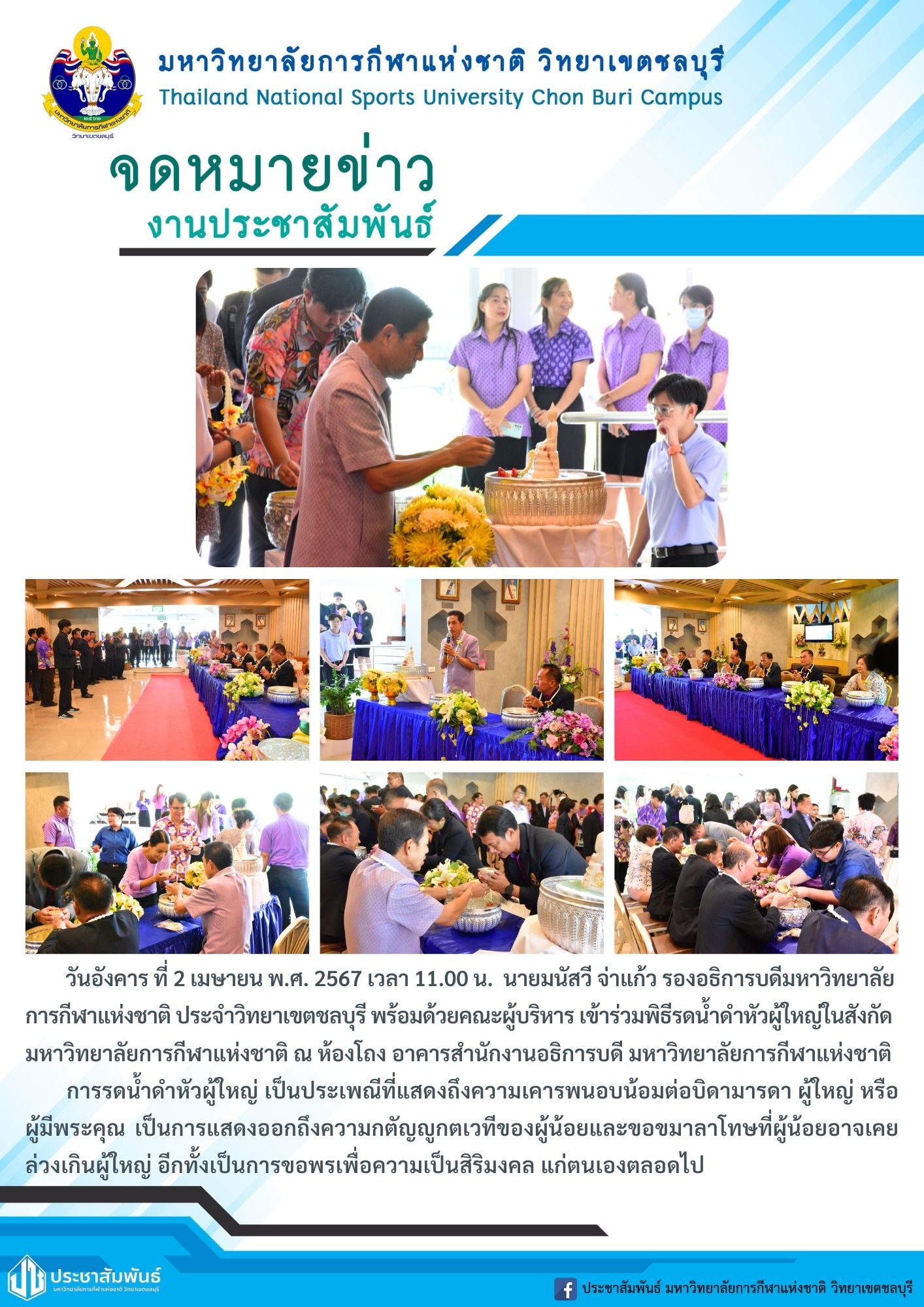 วันอังคาร ที่ 2 เมษายน พ.ศ. 2567 เวลา 11.00 น. นายมนัสวี จ่าแก้ว รองอธิการบดีมหาวิทยาลัยการกีฬาแห่งชาติ ประจำวิทยาเขตชลบุรี พร้อมด้วยคณะผู้บริหาร เข้าร่วมพิธีรดน้ำดำหัวผู้ใหญ่ในสังกัดมหาวิทยาลัยการกีฬาแห่งชาติ ณ ห้องโถง อาคารสำนักงานอธิการบดี มหาวิทยาลัยการกีฬาแห่งชาติ การรดน้ำดำหัวผู้ใหญ่ เป็นประเพณีที่แสดงถึงความเคารพนอบน้อมต่อบิดามารดา ผู้ใหญ่ หรือผู้มีพระคุณ เป็นการแสดงออกถึงความกตัญญูกตเวทีของผู้น้อยและขอขมาลาโทษที่ผู้น้อยอาจเคยล่วงเกินผู้ใหญ่ อีกทั้งเป็นการขอพรเพื่อความเป็นสิริมงคล แก่ตนเองตลอดไป