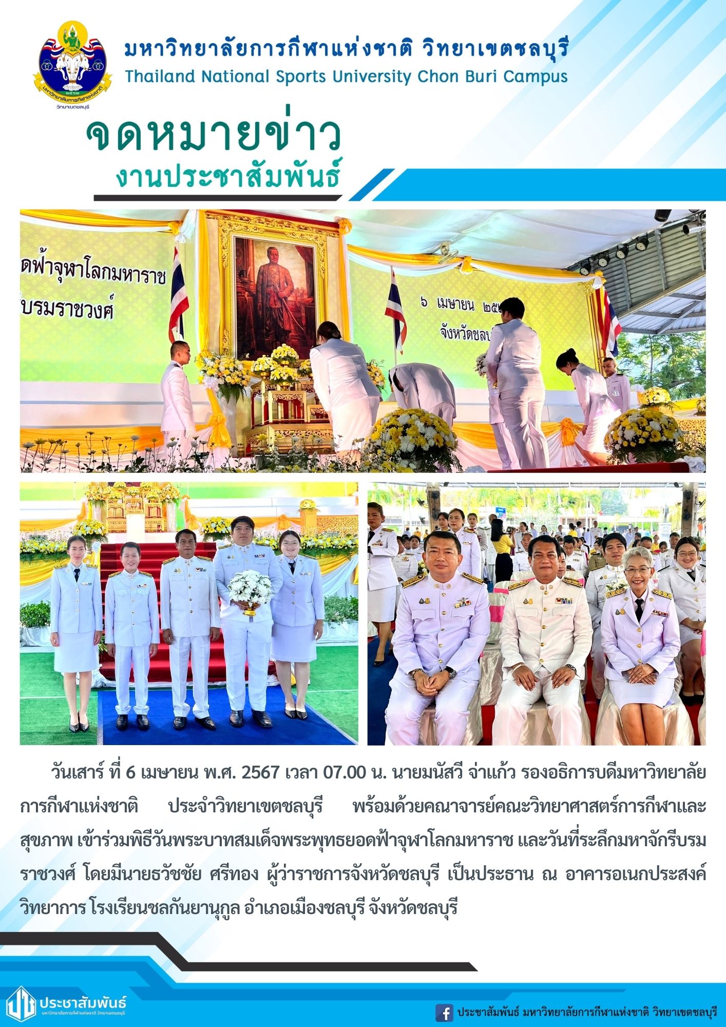 วันเสาร์ ที่ 6 เมษายน พ.ศ. 2567 เวลา 07.00 น. นายมนัสวี จ่าแก้ว รองอธิการบดีมหาวิทยาลัยการกีฬาแห่งชาติ ประจำวิทยาเขตชลบุรี พร้อมด้วยคณาจารย์คณะวิทยาศาสตร์การกีฬาและสุขภาพ เข้าร่วมพิธีวันพระบาทสมเด็จพระพุทธยอดฟ้าจุฬาโลกมหาราช และวันที่ระลึกมหาจักรีบรมราชวงศ์ โดยมีนายธวัชชัย ศรีทอง ผู้ว่าราชการจังหวัดชลบุรี เป็นประธาน ณ อาคารอเนกประสงค์วิทยาการ โรงเรียนชลกันยานุกูล อำเภอเมืองชลบุรี จังหวัดชลบุรี