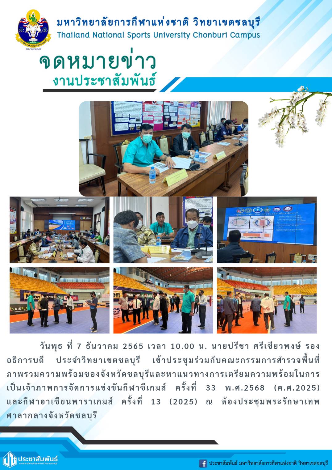 นายปรีชา ศรีเขียวพง์ รองอธิการบดี ประจำวิทยาเขตชลบุรี เข้าประชุมร่วมกับคณะกรรมการสำรวจพื้นที่ความพร้อมของจังหวัดชลบุรีเป็นในการเจ้าภาพการจัดการแข่งขันกีฬาซีเกมส์ ครั้งที่ 33 และกีฬาอาเซียนพาราเกมส์ ครั้งที่ 13