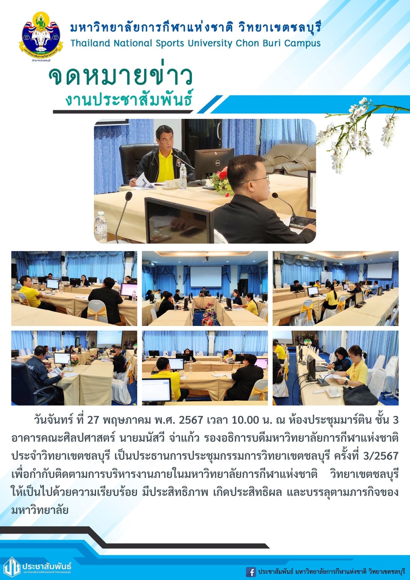 วันจันทร์ ที่ 27 พฤษภาคม พ.ศ. 2567 เวลา 10.00 น. ณ ห้องประชุมมาร์ติน ชั้น 3 อาคารคณะศิลปศาสตร์ นายมนัสวี จ่าแก้ว รองอธิการบดีมหาวิทยาลัยการกีฬาแห่งชาติ ประจำวิทยาเขตชลบุรี เป็นประธานการประชุมกรรมการวิทยาเขตชลบุรี ครั้งที่ 3/2567 เพื่อกำกับติดตามการบริหารงานภายในมหาวิทยาลัยการกีฬาแห่งชาติ วิทยาเขตชลบุรี ให้เป็นไปด้วยความเรียบร้อย มีประสิทธิภาพ เกิดประสิทธิผล และบรรลุตามภารกิจของมหาวิทยาลัย