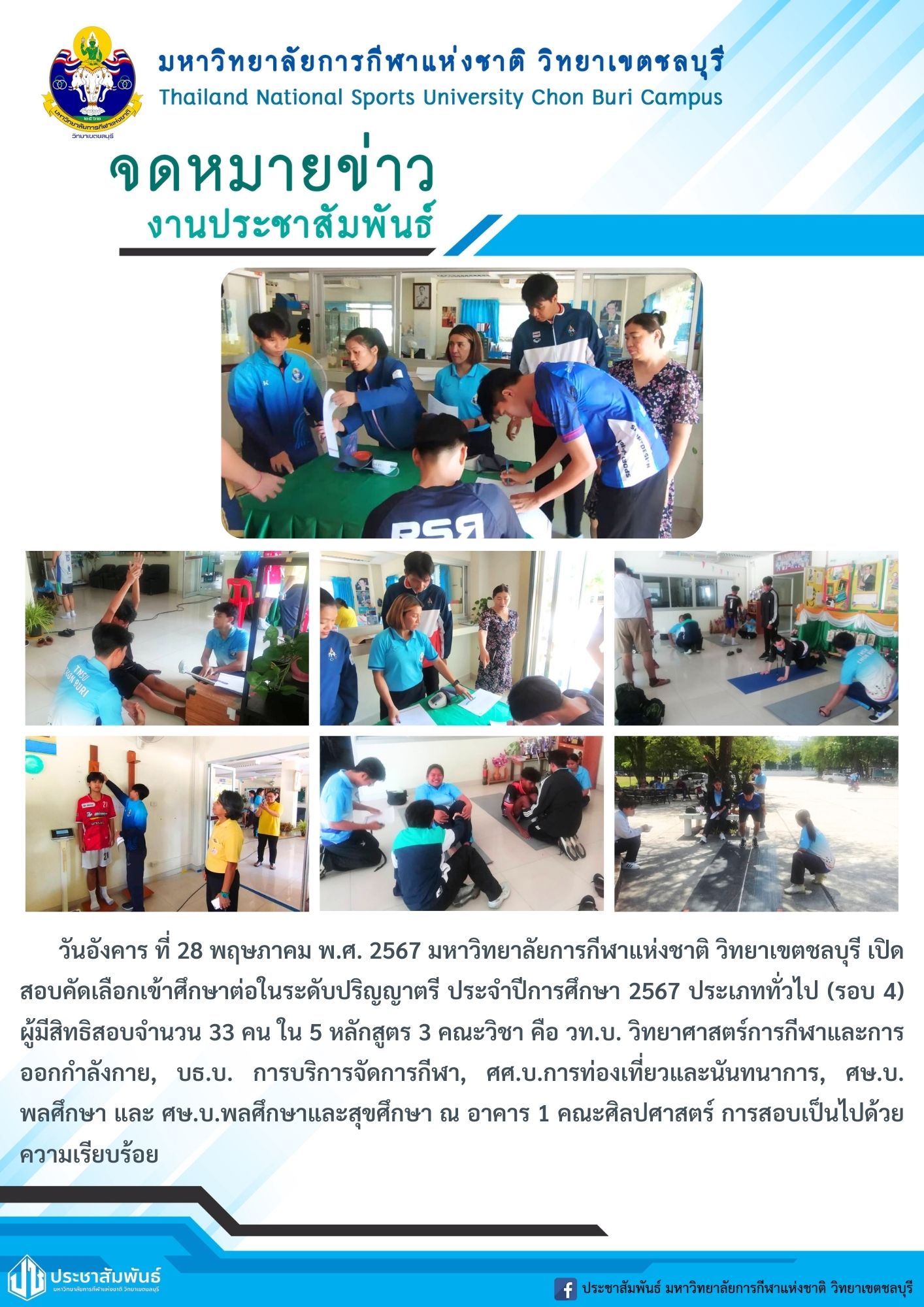 วันอังคาร ที่ 28 พฤษภาคม พ.ศ. 2567 มหาวิทยาลัยการกีฬาแห่งชาติ วิทยาเขตชลบุรี เปิดสอบคัดเลือกเข้าศึกษาต่อในระดับปริญญาตรี ประจำปีการศึกษา 2567 ประเภททั่วไป (รอบ 4) ผู้มีสิทธิสอบจำนวน 33 คน ใน 5 หลักสูตร 3 คณะวิชา คือ วท.บ. วิทยาศาสตร์การกีฬาและการออกกำลังกาย, บธ.บ. การบริการจัดการกีฬา, ศศ.บ.การท่องเที่ยวและนันทนาการ, ศษ.บ. พลศึกษา และ ศษ.บ.พลศึกษาและสุขศึกษา ณ อาคาร 1 คณะศิลปศาสตร์ การสอบเป็นไปด้วยความเรียบร้อย