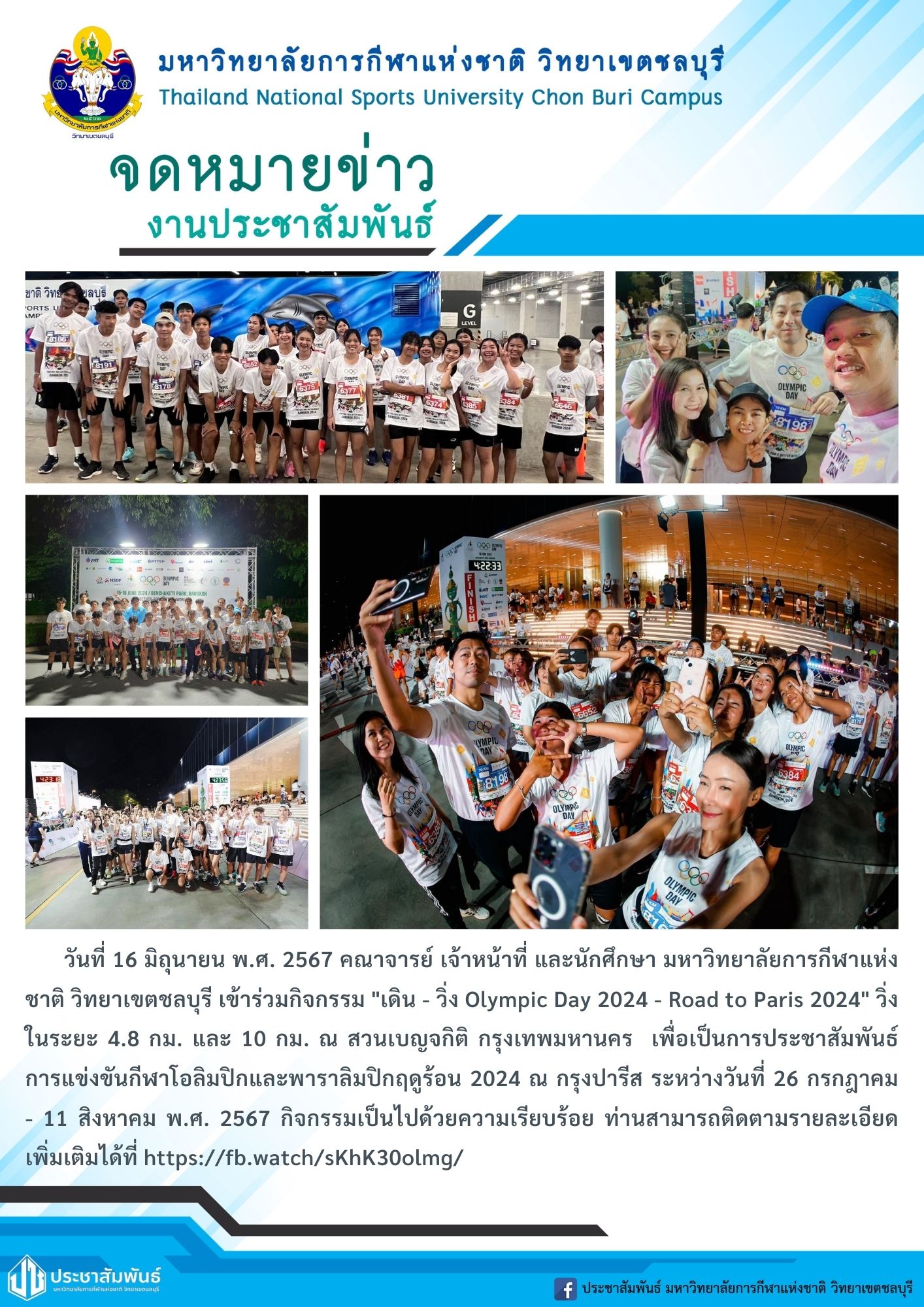 วันอาทิตย์ที่ 16 มิถุนายน พ.ศ. 2567 คณาจารย์ เจ้าหน้าที่ และนักศึกษา มหาวิทยาลัยการกีฬาแห่งชาติ วิทยาเขตชลบุรี เข้าร่วมกิจกรรม "เดิน - วิ่ง Olympic Day 2024 - Road to Paris 2024" วิ่งในระยะ 4.8 กม. และ 10 กม. ณ สวนเบญจกิติ กรุงเทพมหานคร เพื่อเป็นการประชาสัมพันธ์การแข่งขันกีฬาโอลิมปิกและพาราลิมปิกฤดูร้อน 2024 ณ กรุงปารีส ระหว่างวันที่ 26 กรกฎาคม - 11 สิงหาคม พ.ศ. 2567 กิจกรรมเป็นไปด้วยความเรียบร้อยท่านสามารถติดตามรายละเอียดเพิ่มเติมได้ตามลิ้งค์นี้