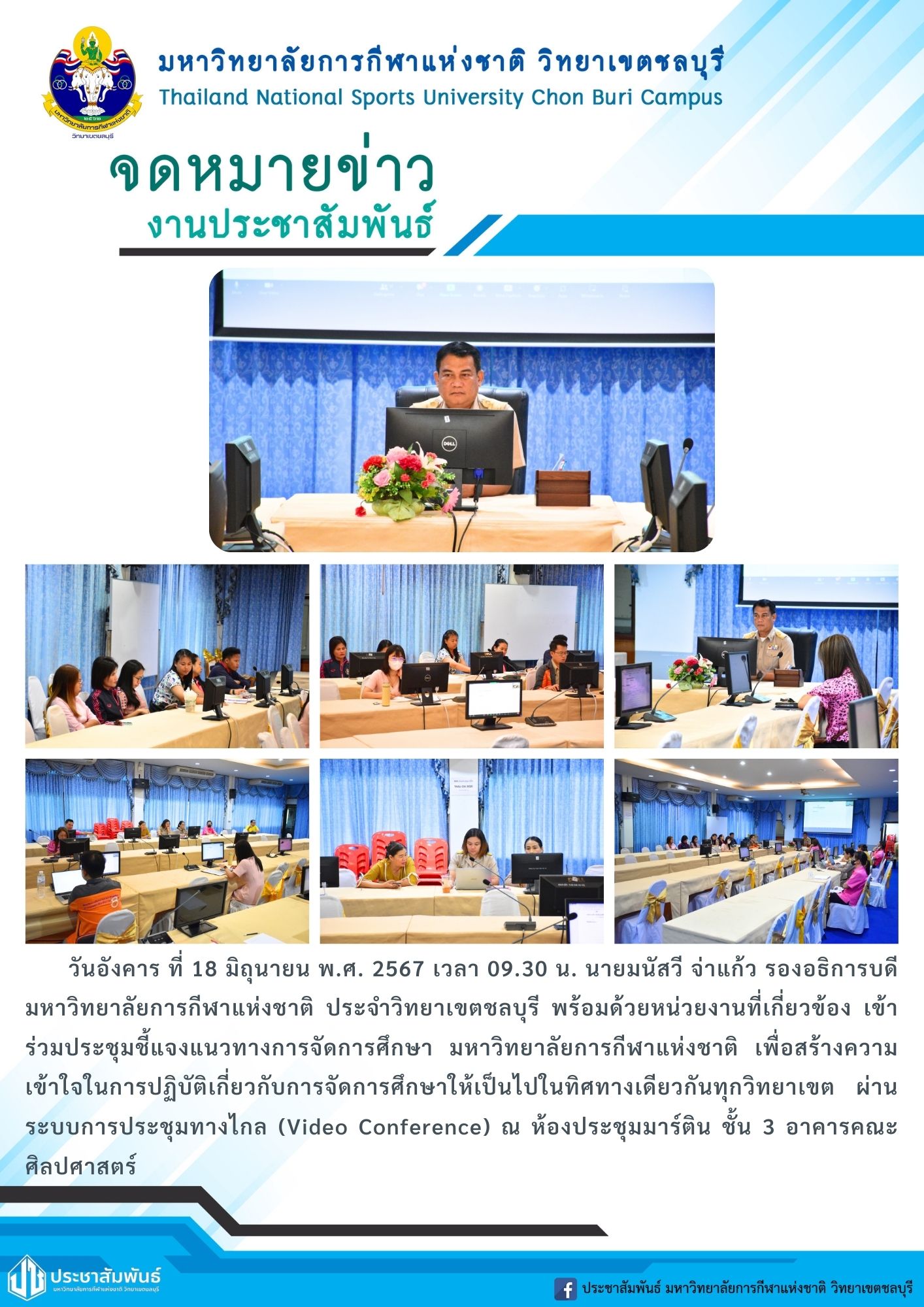 วันอังคาร ที่ 18 มิถุนายน พ.ศ. 2567 เวลา 09.30 น. นายมนัสวี จ่าแก้ว รองอธิการบดีมหาวิทยาลัยการกีฬาแห่งชาติ ประจำวิทยาเขตชลบุรี พร้อมด้วยหน่วยงานที่เกี่ยวข้อง เข้าร่วมประชุมชี้แจงแนวทางการจัดการศึกษา มหาวิทยาลัยการกีฬาแห่งชาติ เพื่อสร้างความเข้าใจในการปฏิบัติเกี่ยวกับการจัดการศึกษาให้เป็นไปในทิศทางเดียวกันทุกวิทยาเขต ผ่านระบบการประชุมทางไกล (Video Conference) ณ ห้องประชุมมาร์ติน ชั้น 3 อาคารคณะศิลปศาสตร์