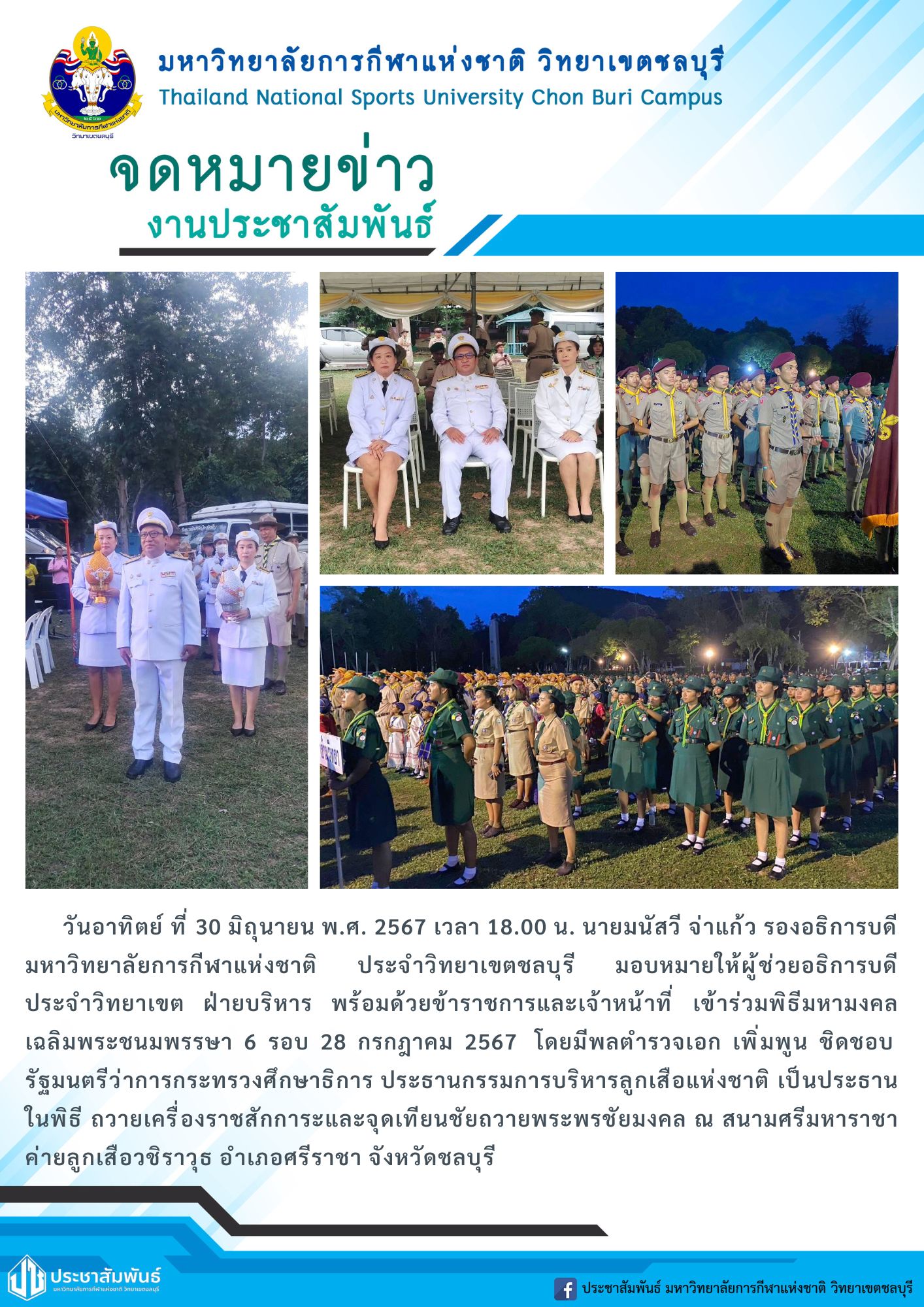 วันอาทิตย์ ที่ 30 มิถุนายน พ.ศ. 2567 เวลา 18.00 น. นายมนัสวี จ่าแก้ว รองอธิการบดีมหาวิทยาลัยการกีฬาแห่งชาติ ประจำวิทยาเขตชลบุรี มอบหมายให้ผู้ช่วยอธิการบดีประจำวิทยาเขต ฝ่ายบริหาร พร้อมด้วยข้าราชการและเจ้าหน้าที่ เข้าร่วมพิธีมหามงคลเฉลิมพระชนมพรรษา 6 รอบ 28 กรกฎาคม 2567 โดยมีพลตำรวจเอก เพิ่มพูน ชิดชอบ รัฐมนตรีว่าการกระทรวงศึกษาธิการ ประธานกรรมการบริหารลูกเสือแห่งชาติ เป็นประธานในพิธี ถวายเครื่องราชสักการะและจุดเทียนชัยถวายพระพรชัยมงคล ณ สนามศรีมหาราชา ค่ายลูกเสือวชิราวุธ อำเภอศรีราชา จังหวัดชลบุรี