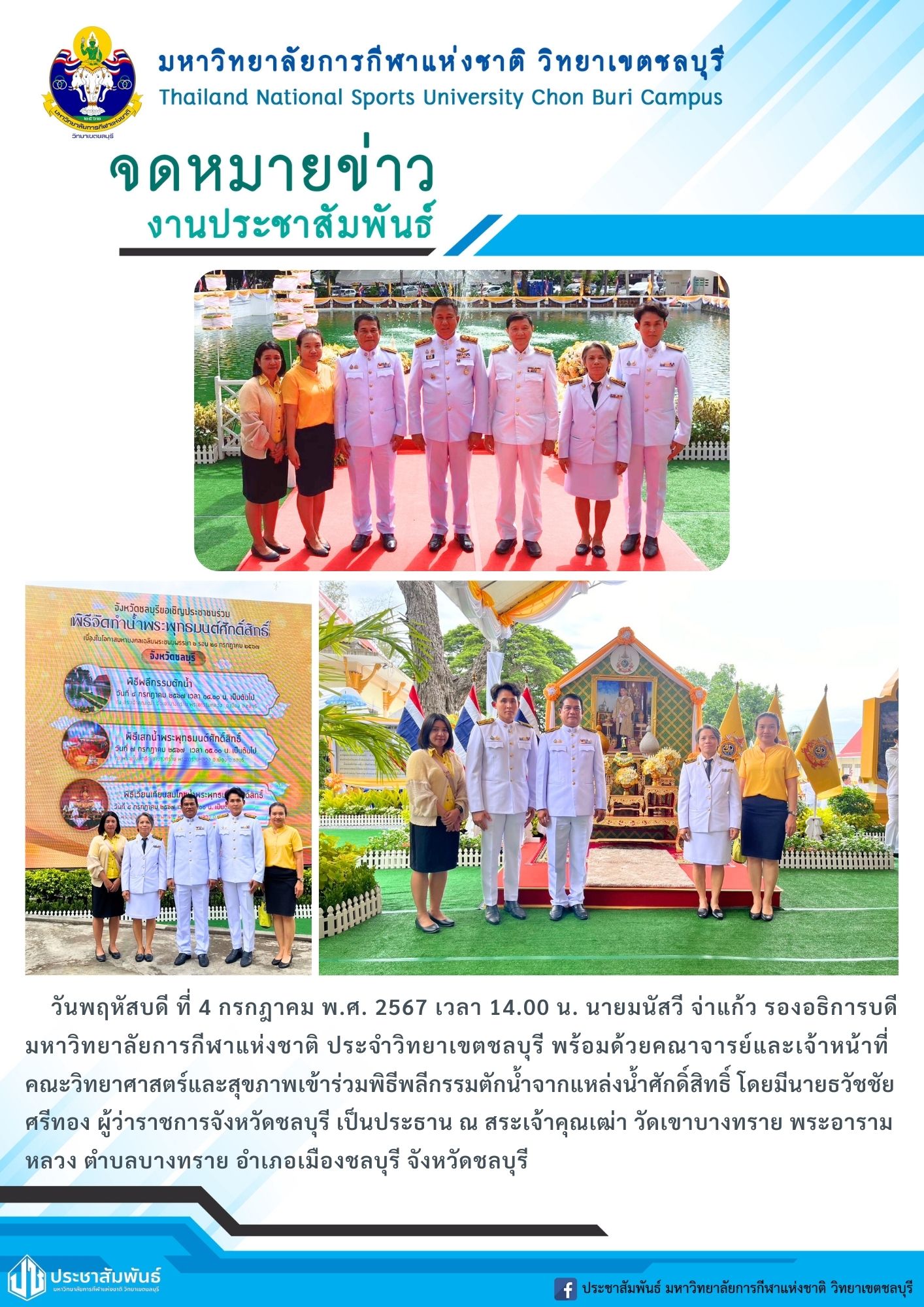 วันพฤหัสบดี ที่ 4 กรกฎาคม พ.ศ. 2567 เวลา 14.00 น. นายมนัสวี จ่าแก้ว รองอธิการบดี มหาวิทยาลัยการกีฬาแห่งชาติ ประจำวิทยาเขตชลบุรี พร้อมด้วยคณาจารย์และเจ้าหน้าที่ คณะวิทยาศาสตร์และสุขภาพเข้าร่วมพิธีพลีกรรมตักน้ำจากแหล่งน้ำศักดิ์สิทธิ์ โดยมีนายธวัชชัย ศรีทอง ผู้ว่าราชการจังหวัดชลบุรี เป็นประธาน ณ สระเจ้าคุณเฒ่า วัดเขาบางทราย พระอารามหลวง ตำบลบางทราย อำเภอเมืองชลบุรี จังหวัดชลบุรี