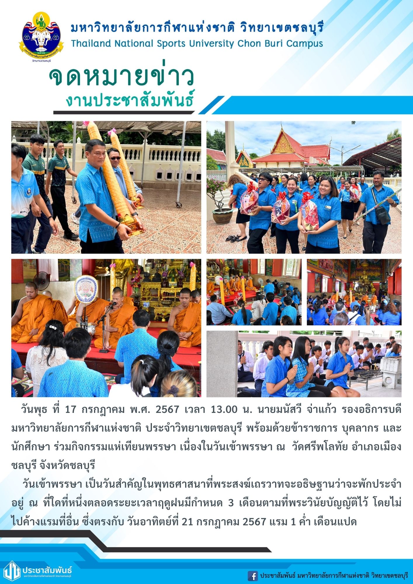 วันพุธ ที่ 17 กรกฎาคม พ.ศ. 2567 เวลา 13.00 น. นายมนัสวี จ่าแก้ว รองอธิการบดี มหาวิทยาลัยการกีฬาแห่งชาติ ประจำวิทยาเขตชลบุรี พร้อมด้วยข้าราชการ บุคลากร และนักศึกษา ร่วมกิจกรรมแห่เทียนพรรษา เนื่องในวันเข้าพรรษา ณ วัดศรีพโลทัย อำเภอเมืองชลบุรี จังหวัดชลบุรี วันเข้าพรรษา เป็นวันสำคัญในพุทธศาสนาที่พระสงฆ์เถรวาทจะอธิษฐานว่าจะพักประจำอยู่ ณ ที่ใดที่หนึ่งตลอดระยะเวลาฤดูฝนมีกำหนด 3 เดือนตามที่พระวินัยบัญญัติไว้ โดยไม่ไปค้างแรมที่อื่น ซึ่งตรงกับ วันอาทิตย์ที่ 21 กรกฎาคม 2567 แรม 1 ค่ำ เดือนแปด