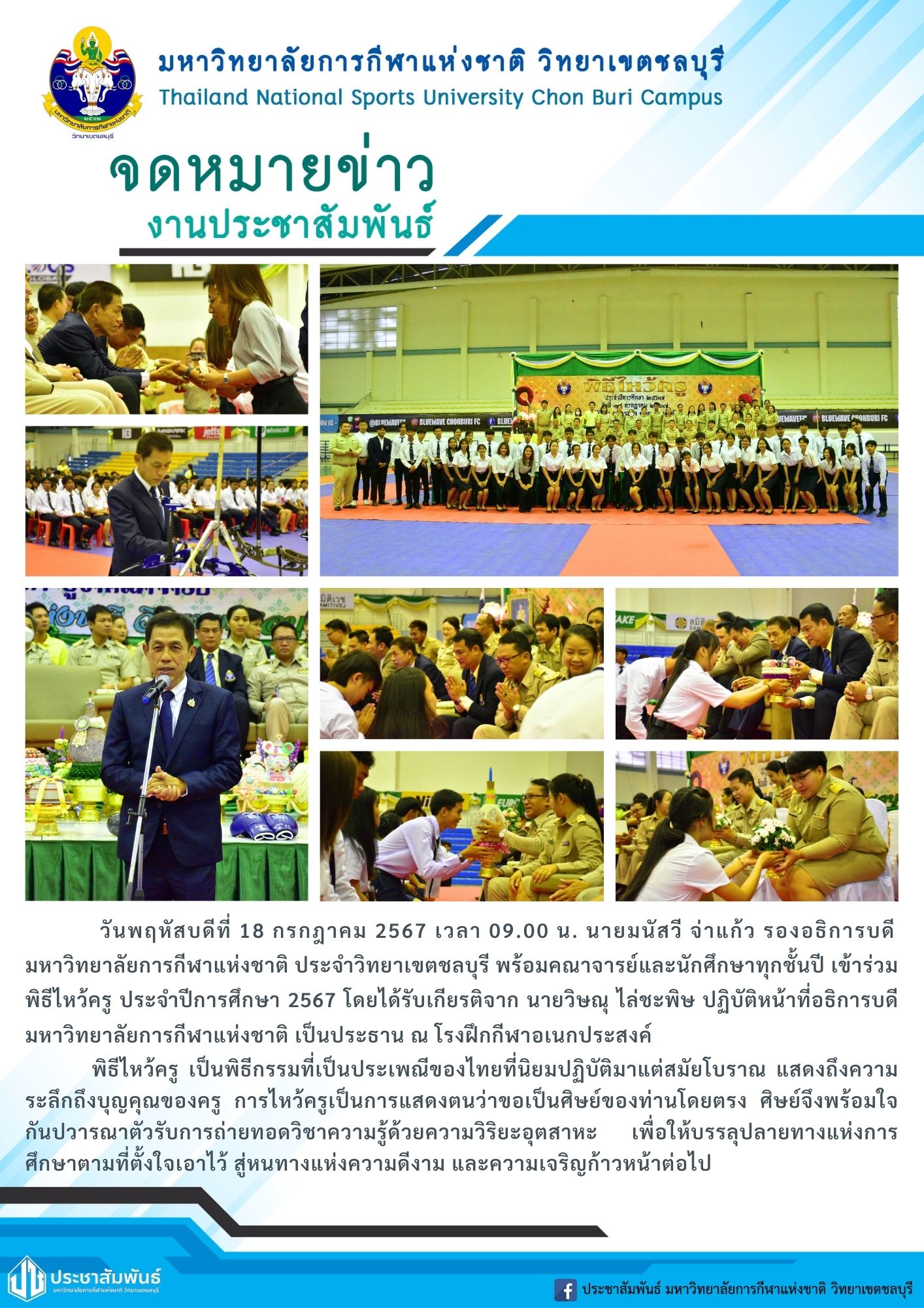 วันพฤหัสบดีที่ 18 กรกฎาคม 2567 เวลา 09.00 น. นายมนัสวี จ่าแก้ว รองอธิการบดีมหาวิทยาลัยการกีฬาแห่งชาติ ประจำวิทยาเขตชลบุรี พร้อมคณาจารย์และนักศึกษาทุกชั้นปี เข้าร่วมพิธีไหว้ครู ประจำปีการศึกษา 2567 โดยได้รับเกียรติจาก นายวิษณุ ไล่ชะพิษ ปฏิบัติหน้าที่อธิการบดีมหาวิทยาลัยการกีฬาแห่งชาติ เป็นประธาน ณ โรงฝึกกีฬาอเนกประสงค์ พิธีไหว้ครู เป็นพิธีกรรมที่เป็นประเพณีของไทยที่นิยมปฏิบัติมาแต่สมัยโบราณ แสดงถึงความระลึกถึงบุญคุณของครู การไหว้ครูเป็นการแสดงตนว่าขอเป็นศิษย์ของท่านโดยตรง ศิษย์จึงพร้อมใจกันปวารณาตัวรับการถ่ายทอดวิชาความรู้ด้วยความวิริยะอุตสาหะ เพื่อให้บรรลุปลายทางแห่งการศึกษาตามที่ตั้งใจเอาไว้ สู่หนทางแห่งความดีงาม และความเจริญก้าวหน้าต่อไป