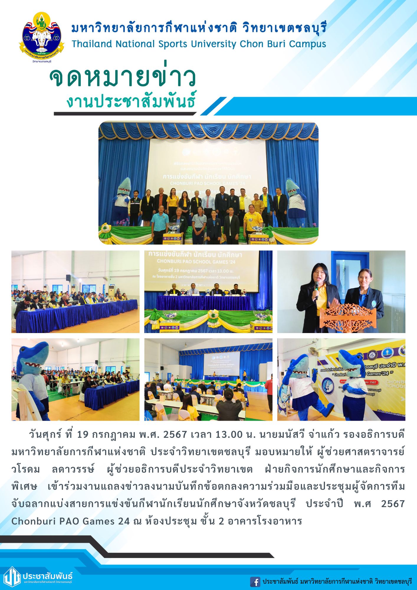 งานแถลงข่าวลงนามบันทึกข้อตกลงความร่วมมือและประชุมผู้จัดการทีม จับฉลากแบ่งสายการแข่งขันกีฬานักเรียนนักศึกษาจังหวัดชลบุรี ประจำปี พ.ศ 2567 Chonburi PAO Games 24