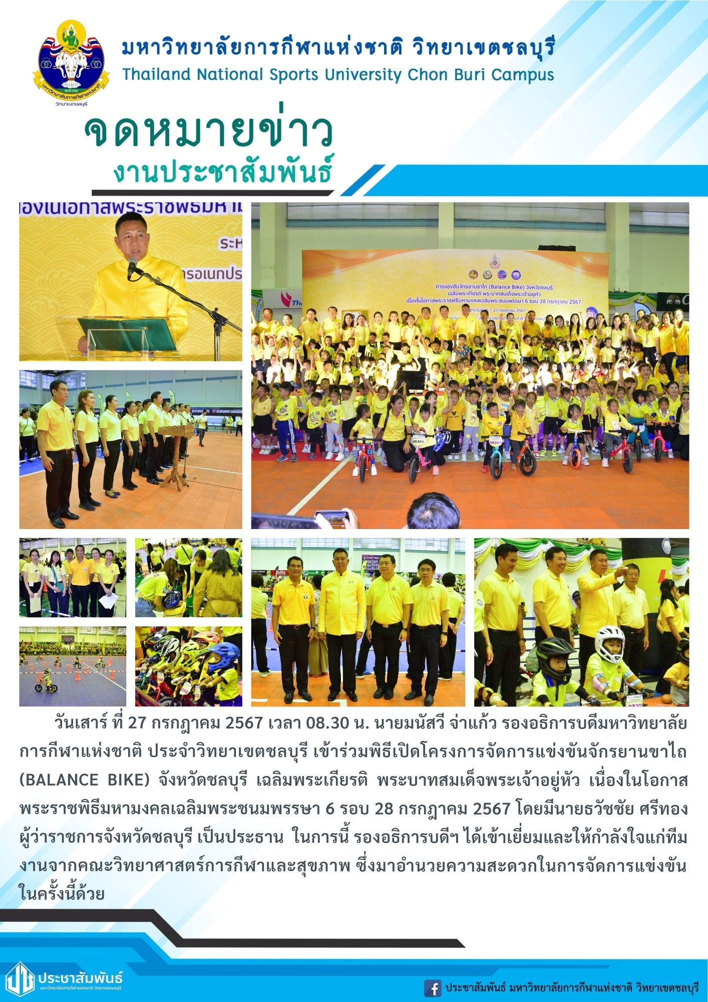วันเสาร์ ที่ 27 กรกฎาคม 2567 เวลา 08.30 น. นายมนัสวี จ่าแก้ว รองอธิการบดีมหาวิทยาลัยการกีฬาแห่งชาติ ประจำวิทยาเขตชลบุรี เข้าร่วมพิธีเปิดโครงการจัดการแข่งขันจักรยานขาไถ (Balance bike) จังหวัดชลบุรี เฉลิมพระเกียรติ พระบาทสมเด็จพระเจ้าอยู่หัว เนื่องในโอกาสพระราชพิธีมหามงคลเฉลิมพระชนมพรรษา 6 รอบ 28 กรกฎาคม 2567 โดยมีนายธวัชชัย ศรีทอง ผู้ว่าราชการจังหวัดชลบุรี เป็นประธาน ในการนี้ รองอธิการบดีฯ ได้เข้าเยี่ยมและให้กำลังใจแก่ทีมงานจากคณะวิทยาศาสตร์การกีฬาและสุขภาพ ซึ่งมาอำนวยความสะดวกในการจัดการแข่งขัน ในครั้งนี้ด้วย