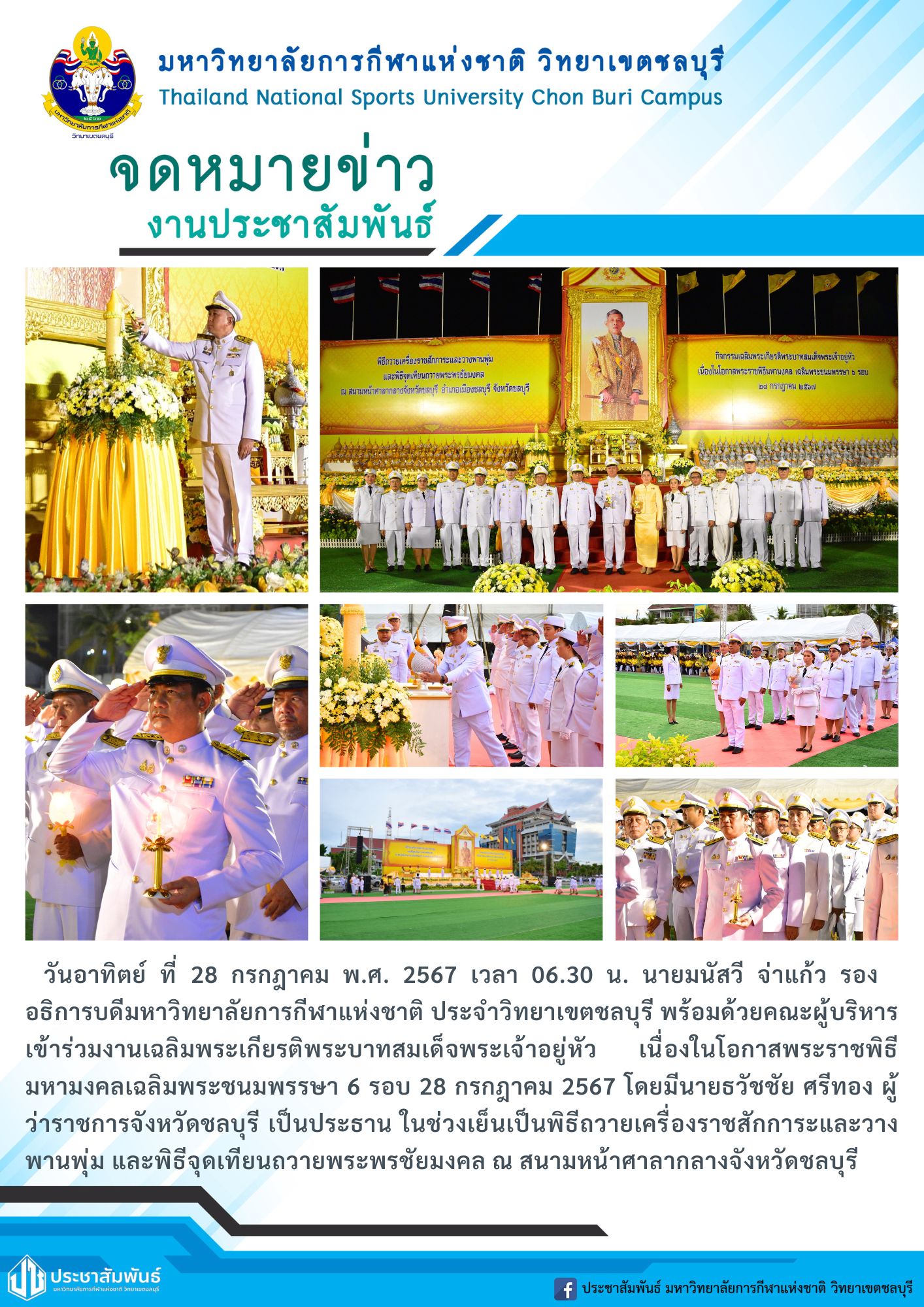 วันอาทิตย์ ที่ 28 กรกฎาคม พ.ศ. 2567 เวลา 06.30 น. นายมนัสวี จ่าแก้ว รองอธิการบดีมหาวิทยาลัยการกีฬาแห่งชาติ ประจำวิทยาเขตชลบุรี พร้อมด้วยคณะผู้บริหาร เข้าร่วมงานเฉลิมพระเกียรติพระบาทสมเด็จพระเจ้าอยู่หัว เนื่องในโอกาสพระราชพิธีมหามงคลเฉลิมพระชนมพรรษา 6 รอบ 28 กรกฎาคม 2567 โดยมีนายธวัชชัย ศรีทอง ผู้ว่าราชการจังหวัดชลบุรี เป็นประธาน ในช่วงเย็นเป็นพิธีถวายเครื่องราชสักการะและวางพานพุ่ม และพิธีจุดเทียนถวายพระพรชัยมงคล ณ สนามหน้าศาลากลางจังหวัดชลบุรี