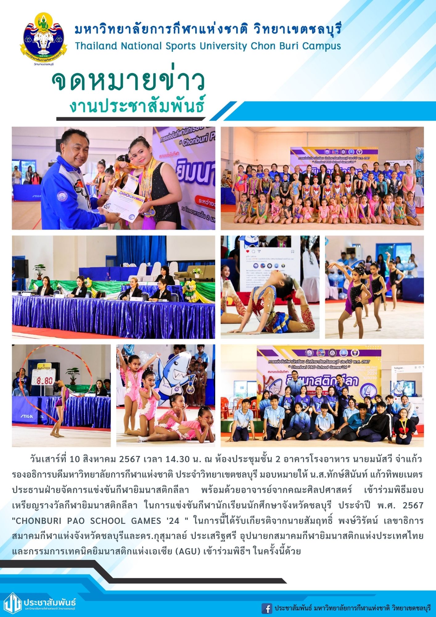 วันเสาร์ที่ 10 สิงหาคม 2567 เวลา 14.30 น. ณ ห้องประชุมชั้น 2 อาคารโรงอาหาร นายมนัสวี จ่าแก้ว รองอธิการบดีมหาวิทยาลัยการกีฬาแห่งชาติ ประจำวิทยาเขตชลบุรี มอบหมายให้ น.ส.ทักษ์สินันท์ แก้วทิพยเนตร ประธานฝ่ายจัดการแข่งขันกีฬายิมนาสติกลีลา พร้อมด้วยอาจารย์จากคณะศิลปศาสตร์ เข้าร่วมพิธีมอบเหรียญรางวัลกีฬายิมนาสติกลีลา ในการแข่งขันกีฬานักเรียนนักศึกษาจังหวัดชลบุรี ประจำปี พ.ศ. 2567 "CHONBURI PAO SCHOOL GAMES '24 " ในการนี้ได้รับเกียรติจากนายสัมฤทธิ์ พงษ์วิรัตน์ เลขาธิการสมาคมกีฬาแห่งจังหวัดชลบุรีและดร.กุสุมาลย์ ประเสริฐศรี อุปนายกสมาคมกีฬายิมนาสติกแห่งประเทศไทยและกรรมการเทคนิคยิมนาสติกแห่งเอเซีย (AGU) เข้าร่วมพิธีฯ ในครั้งนี้ด้วย