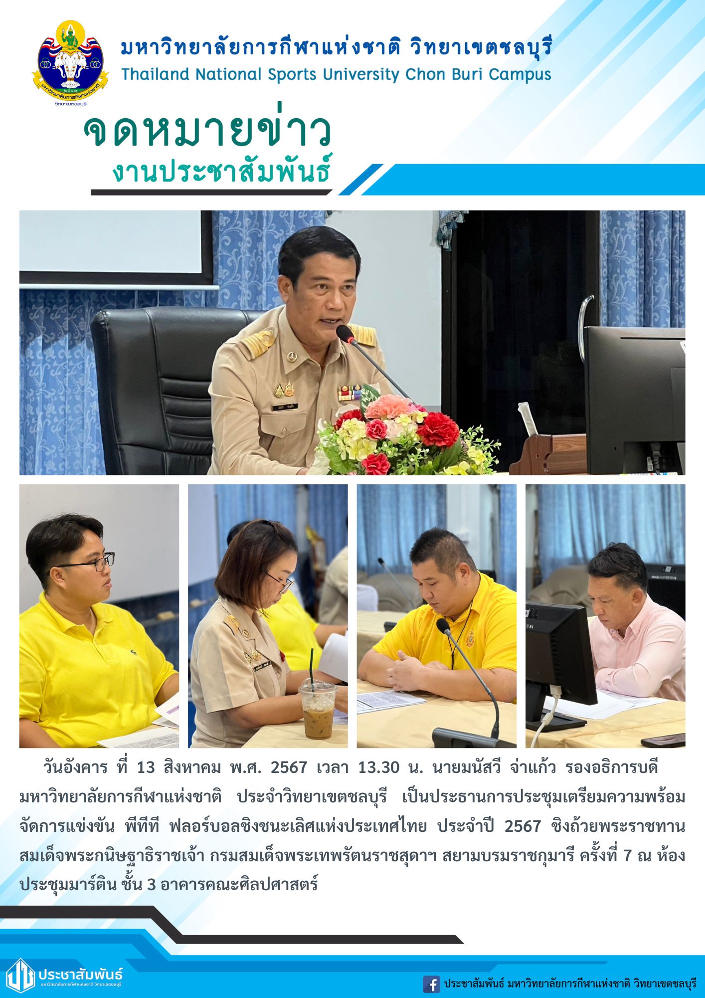 วันอังคาร ที่ 13 สิงหาคม พ.ศ. 2567 เวลา 13.30 น. นายมนัสวี จ่าแก้ว รองอธิการบดี มหาวิทยาลัยการกีฬาแห่งชาติ ประจำวิทยาเขตชลบุรี เป็นประธานการประชุมเตรียมความพร้อมจัดการแข่งขัน พีทีที ฟลอร์บอลชิงชนะเลิศแห่งประเทศไทย ประจำปี 2567 ชิงถ้วยพระราชทานสมเด็จพระกนิษฐาธิราชเจ้า กรมสมเด็จพระเทพรัตนราชสุดาฯ สยามบรมราชกุมารี ครั้งที่ 7 ณ ห้องประชุมมาร์ติน ชั้น 3 อาคารคณะศิลปศาสตร์