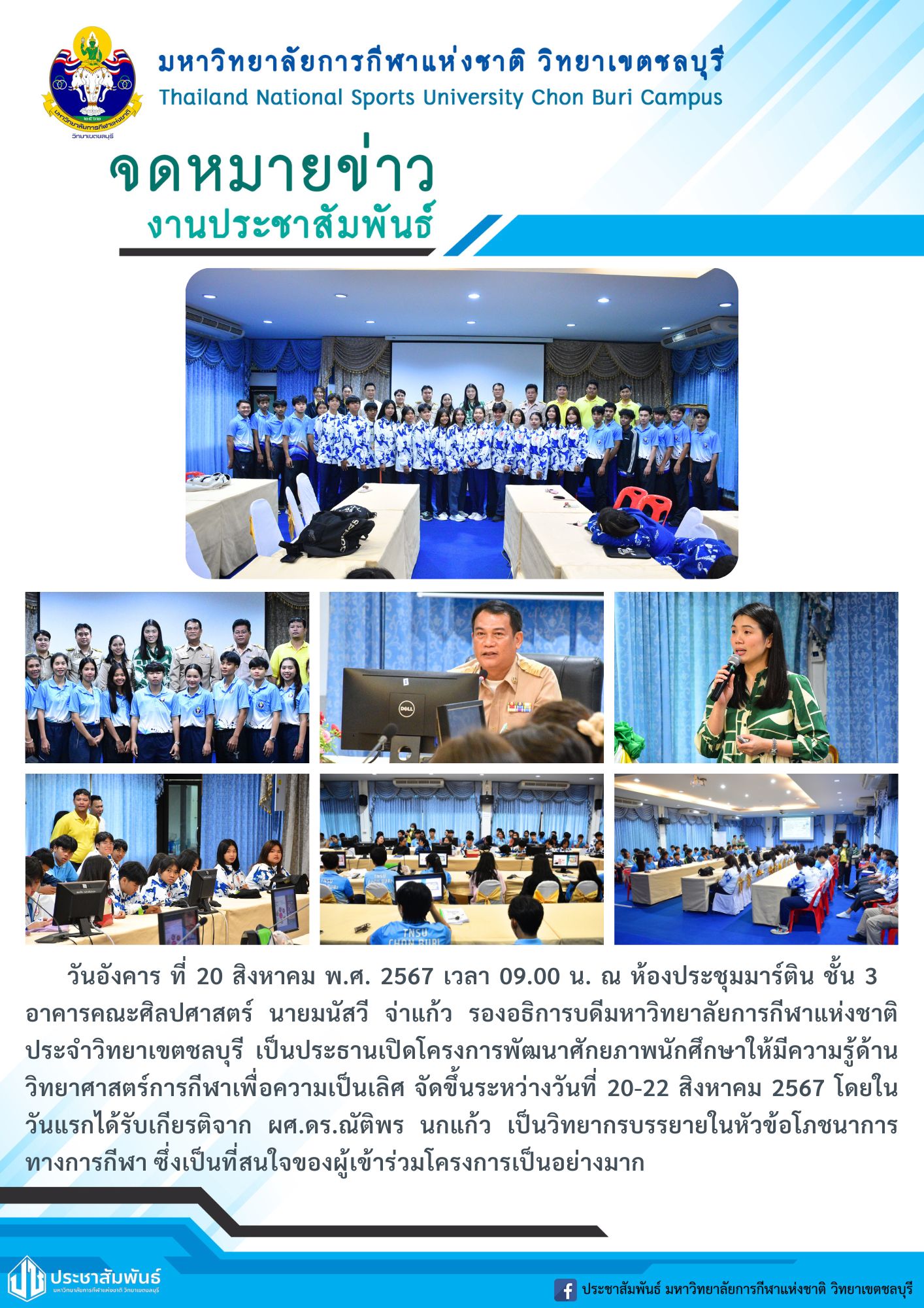วันอังคาร ที่ 20 สิงหาคม พ.ศ. 2567 เวลา 09.00 น. ณ ห้องประชุมมาร์ติน ชั้น 3 อาคารคณะศิลปศาสตร์ นายมนัสวี จ่าแก้ว รองอธิการบดีมหาวิทยาลัยการกีฬาแห่งชาติ ประจำวิทยาเขตชลบุรี เป็นประธานเปิดโครงการพัฒนาศักยภาพนักศึกษาให้มีความรู้ด้านวิทยาศาสตร์การกีฬาเพื่อความเป็นเลิศ จัดขึ้นระหว่างวันที่ 20-22 สิงหาคม 2567 โดยในวันแรกได้รับเกียรติจาก ผศ.ดร.ณัติพร นกแก้ว เป็นวิทยากรบรรยายในหัวข้อโภชนาการทางการกีฬา ซึ่งเป็นที่สนใจของผู้เข้าร่วมโครงการเป็นอย่างมาก