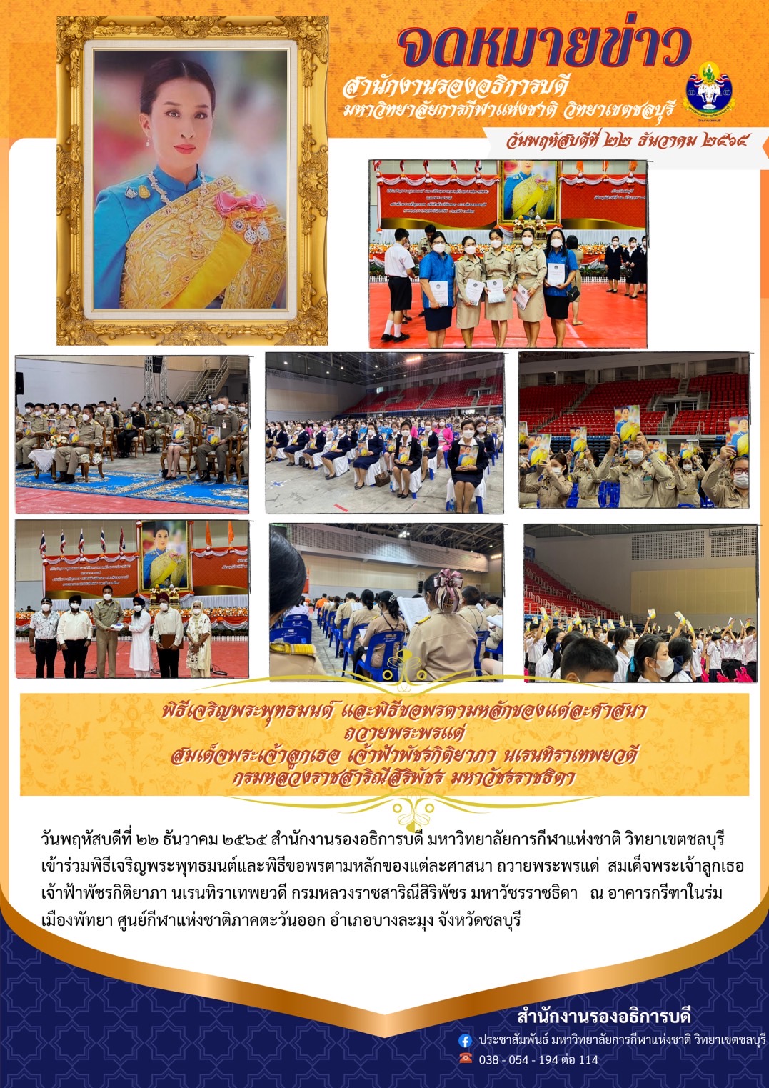 วันที่พฤหัสบดี ที่ 22 ธันวาคม 2565 สำนักงานรองอธิการบดี มหาวิทยาลัยการกีฬาแห่งชาติ วิทยาเขตชลบุรี เข้าร่วมพิธีเจริญพระพุทธมนต์ และพิธีขอพรตามหลักศาสนาถวายพระพรแด่สมเด็จพระเจ้าลูกเธอ เจ้าฟ้าพัชกิติยาภา นเรนทิราเทพยวดี กรมหลวงราชสาริณีสิริพัชร มหาวัชรราชธิดา