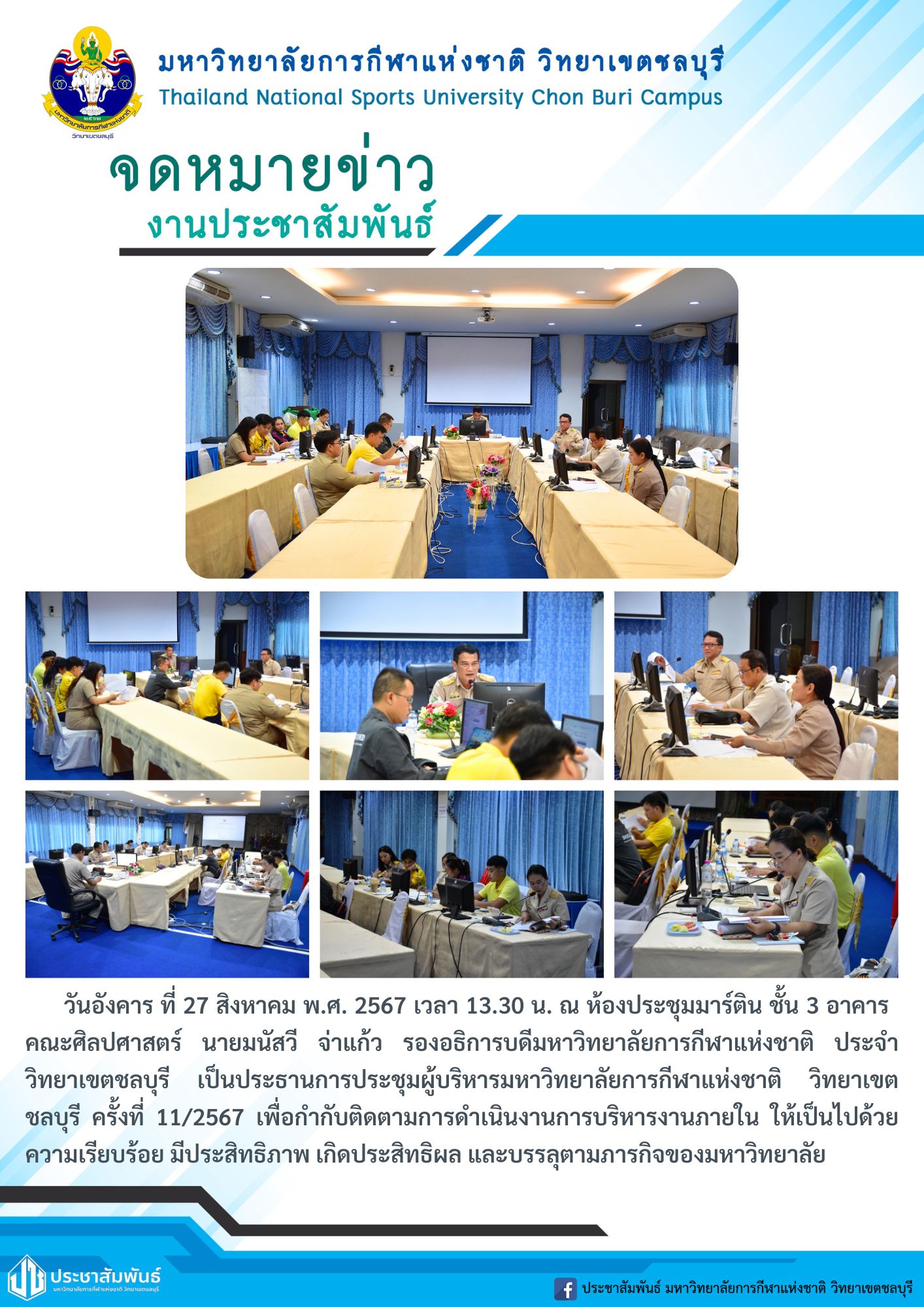 วันอังคาร ที่ 27 สิงหาคม พ.ศ. 2567 เวลา 13.30 น. ณ ห้องประชุมมาร์ติน ชั้น 3 อาคารคณะศิลปศาสตร์ นายมนัสวี จ่าแก้ว รองอธิการบดีมหาวิทยาลัยการกีฬาแห่งชาติ ประจำวิทยาเขตชลบุรี เป็นประธานการประชุมผู้บริหารมหาวิทยาลัยการกีฬาแห่งชาติ วิทยาเขตชลบุรี ครั้งที่ 11/2567 เพื่อกำกับติดตามการดำเนินงานการบริหารงานภายใน ให้เป็นไปด้วยความเรียบร้อย มีประสิทธิภาพ เกิดประสิทธิผล และบรรลุตามภารกิจของมหาวิทยาลัย