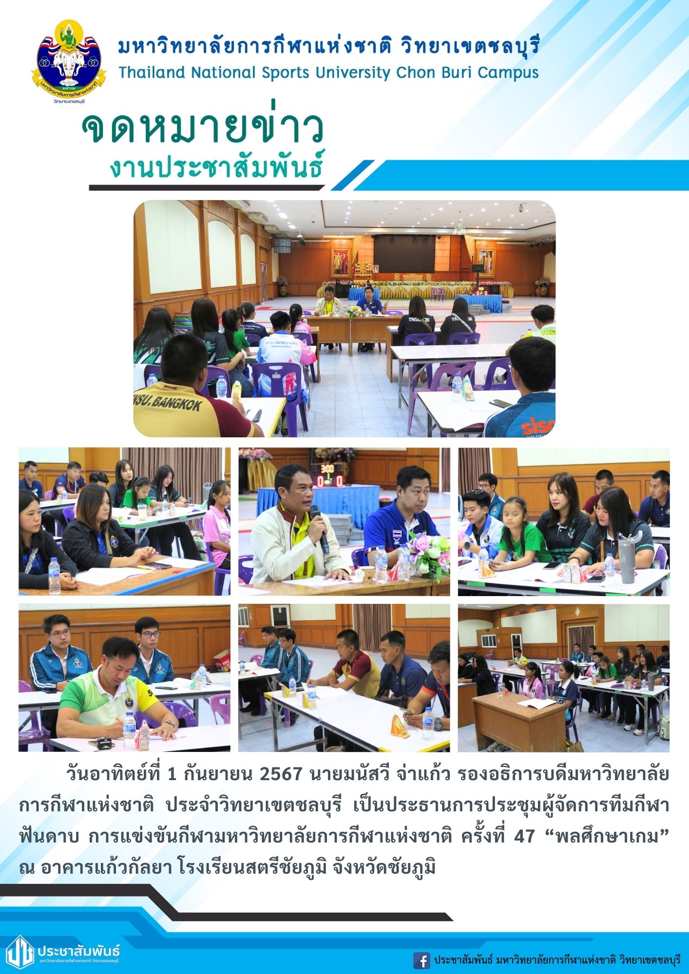 วันอาทิตย์ที่ 1 กันยายน 2567 นายมนัสวี จ่าแก้ว รองอธิการบดีมหาวิทยาลัยการกีฬาแห่งชาติ ประจำวิทยาเขตชลบุรี เป็นประธานการประชุมผู้จัดการทีมกีฬาฟันดาบ การแข่งขันกีฬามหาวิทยาลัยการกีฬาแห่งชาติ ครั้งที่ 47 “พลศึกษาเกม” ณ อาคารแก้วกัลยา โรงเรียนสตรีชัยภูมิ จังหวัดชัยภูมิ
