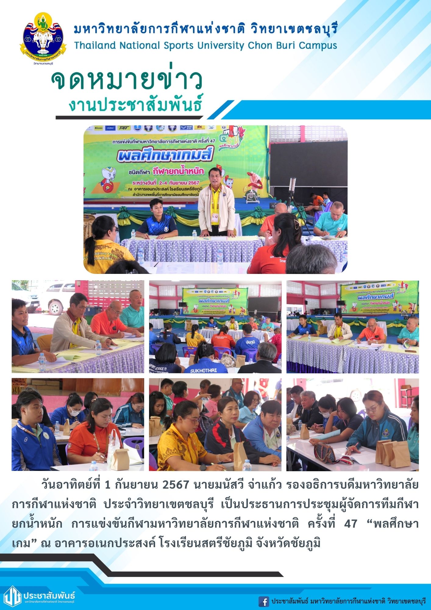 วันอาทิตย์ที่ 1 กันยายน 2567 นายมนัสวี จ่าแก้ว รองอธิการบดีมหาวิทยาลัยการกีฬาแห่งชาติ ประจำวิทยาเขตชลบุรี เป็นประธานการประชุมผู้จัดการทีมกีฬายกน้ำหนัก การแข่งขันกีฬามหาวิทยาลัยการกีฬาแห่งชาติ ครั้งที่ 47 “พลศึกษาเกม” ณ อาคารอเนกประสงค์ โรงเรียนสตรีชัยภูมิ จังหวัดชัยภูมิ