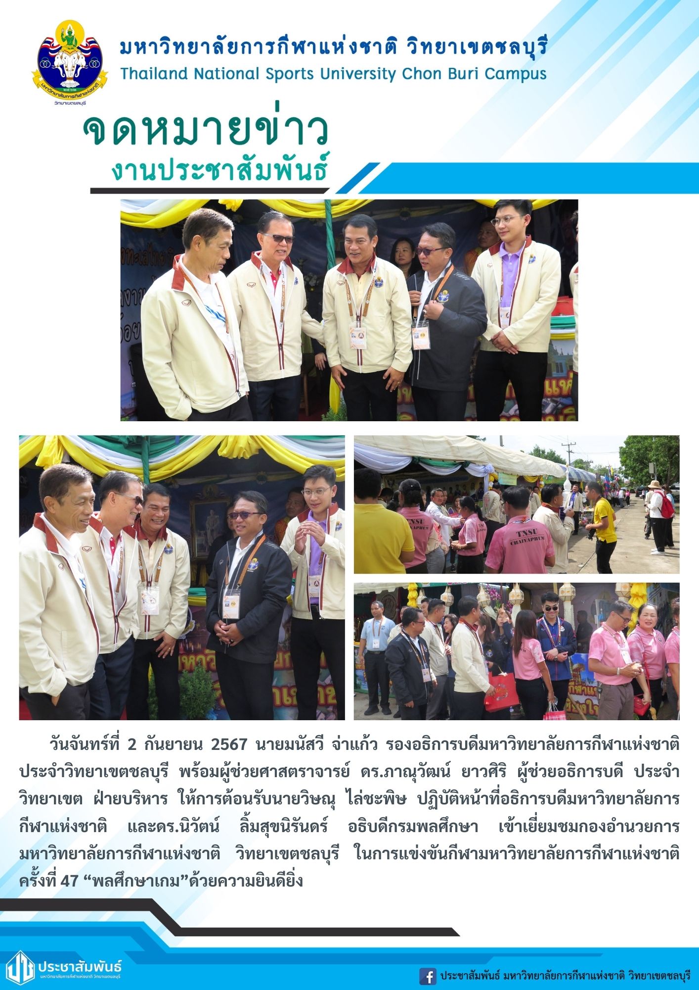 วันจันทร์ที่ 2 กันยายน 2567 นายมนัสวี จ่าแก้ว รองอธิการบดีมหาวิทยาลัยการกีฬาแห่งชาติ ประจำวิทยาเขตชลบุรี พร้อมผู้ช่วยศาสตราจารย์ ดร.ภาณุวัฒน์ ยาวศิริ ผู้ช่วยอธิการบดี ประจำวิทยาเขต ฝ่ายบริหาร ให้การต้อนรับนายวิษณุ ไล่ชะพิษ ปฏิบัติหน้าที่อธิการบดีมหาวิทยาลัยการกีฬาแห่งชาติ และดร.นิวัตน์ ลิ้มสุขนิรันดร์ อธิบดีกรมพลศึกษา เข้าเยี่ยมชมกองอำนวยการมหาวิทยาลัยการกีฬาแห่งชาติ วิทยาเขตชลบุรี ในการแข่งขันกีฬามหาวิทยาลัยการกีฬาแห่งชาติ ครั้งที่ 47 “พลศึกษาเกม”ด้วยความยินดียิ่ง