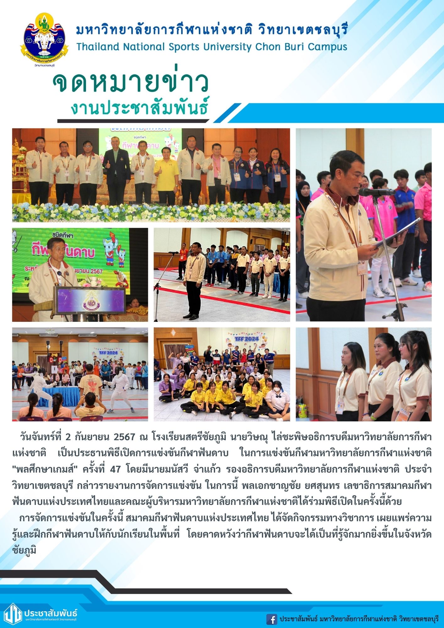 วันจันทร์ที่ 2 กันยายน 2567 ณ โรงเรียนสตรีชัยภูมิ นายวิษณุ ไล่ชะพิษอธิการบดีมหาวิทยาลัยการกีฬาแห่งชาติ เป็นประธานพิธีเปิดการแข่งขันกีฬาฟันดาบ ในการแข่งขันกีฬามหาวิทยาลัยการกีฬาแห่งชาติ "พลศึกษาเกมส์" ครั้งที่ 47 โดยมีนายมนัสวี จ่าแก้ว รองอธิการบดีมหาวิทยาลัยการกีฬาแห่งชาติ ประจำวิทยาเขตชลบุรี กล่าวรายงานการจัดการแข่งขัน ในการนี้ พลเอกชาญชัย ยศสุนทร เลขาธิการสมาคมกีฬาฟันดาบแห่งประเทศไทยและคณะผู้บริหารมหาวิทยาลัยการกีฬาแห่งชาติได้ร่วมพิธีเปิดในครั้งนี้ด้วย การจัดการแข่งขันในครั้งนี้ สมาคมกีฬาฟันดาบแห่งประเทศไทย ได้จัดกิจกรรมทางวิชาการ เผยแพร่ความรู้และฝึกกีฬาฟันดาบให้กับนักเรียนในพื้นที่ โดยคาดหวังว่ากีฬาฟันดาบจะได้เป็นที่รู้จักมากยิ่งขึ้นในจังหวัดชัยภูมิ