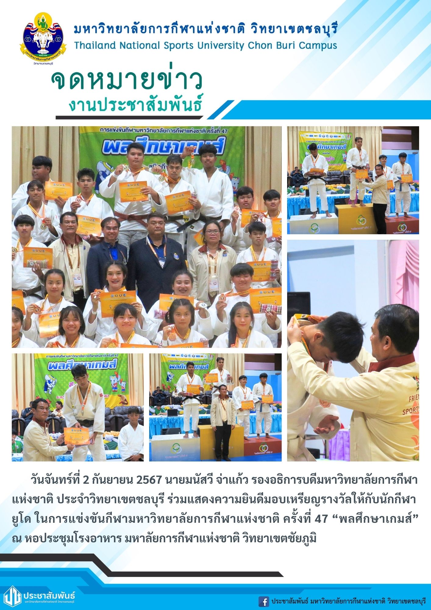 วันจันทร์ที่ 2 กันยายน 2567 นายมนัสวี จ่าแก้ว รองอธิการบดีมหาวิทยาลัยการกีฬา แห่งชาติ ประจำวิทยาเขตชลบุรี ร่วมแสดงความยินดีมอบเหรียญรางวัลให้กับนักกีฬา ยูโด ในการแข่งขันกีฬามหาวิทยาลัยการกีฬาแห่งชาติ ครั้งที่ 47 “พลศึกษาเกมส์” ณ หอประชุมโรงอาหาร มหาลัยการกีฬาแห่งชาติ วิทยาเขตชัยภูมิ